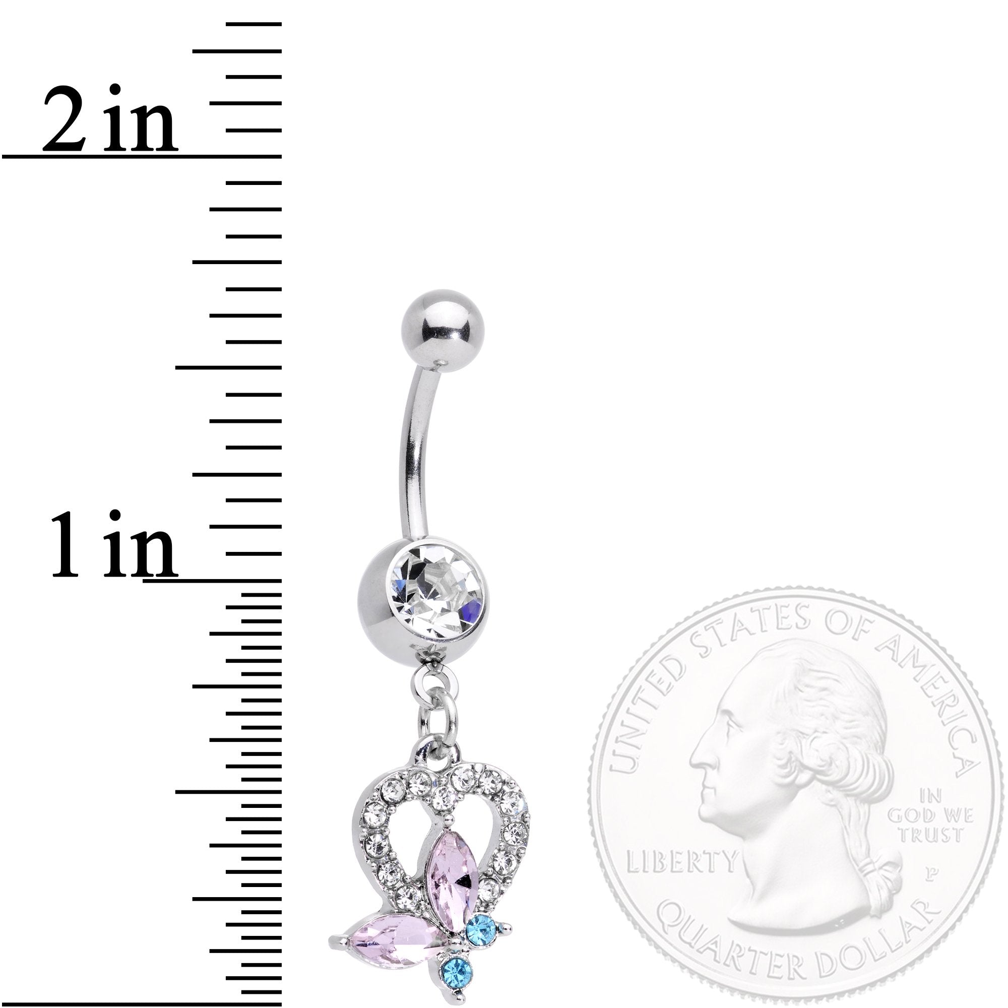 If you're all about springtime then look no further than this pretty 14 gauge belly button ring. Made with a 7/16" durable 316L surgical grade stainless steel curved barbell, this navel ring features a clear gem bottom ball end as well as a heart dangle charm formed with clear gems that features a butterfly accent with pink and blue gems.