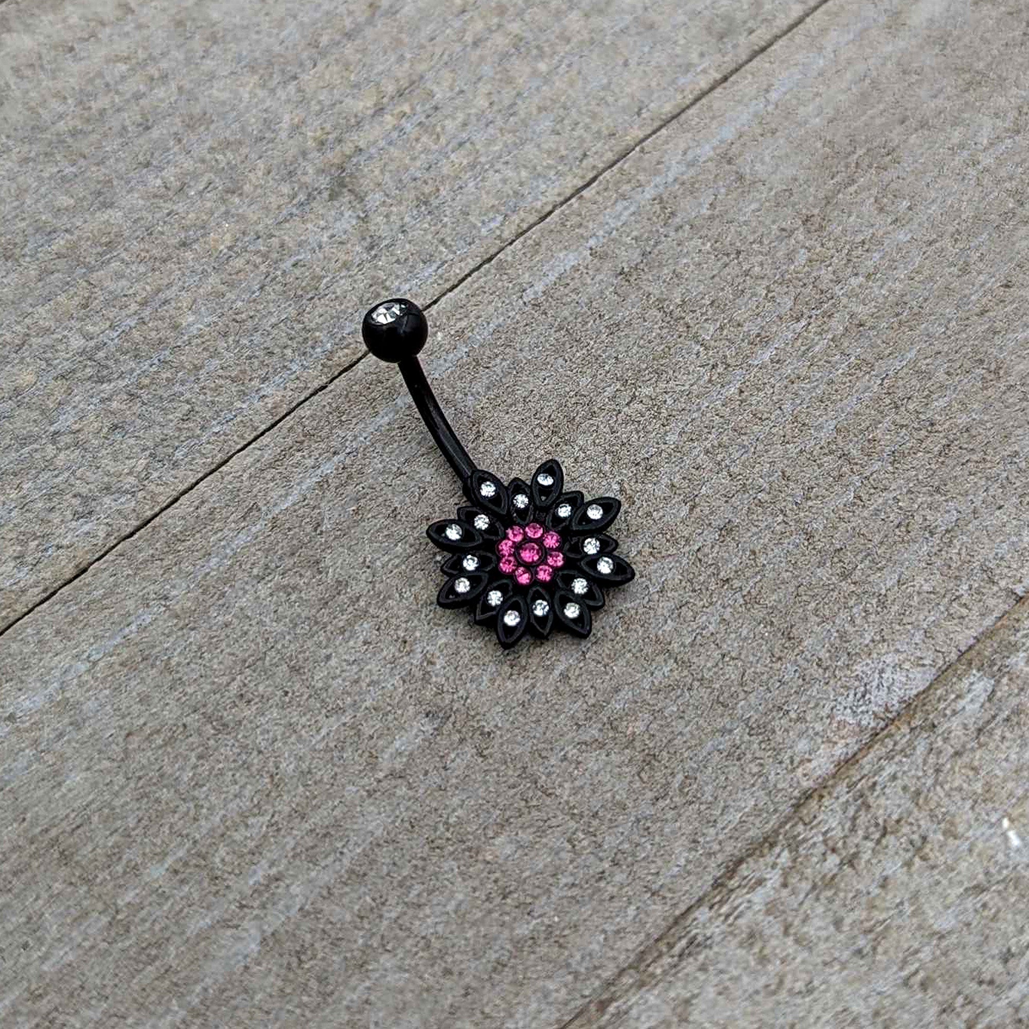 Clear Pink Gem Black Midnight Flower Blooming Belly Ring