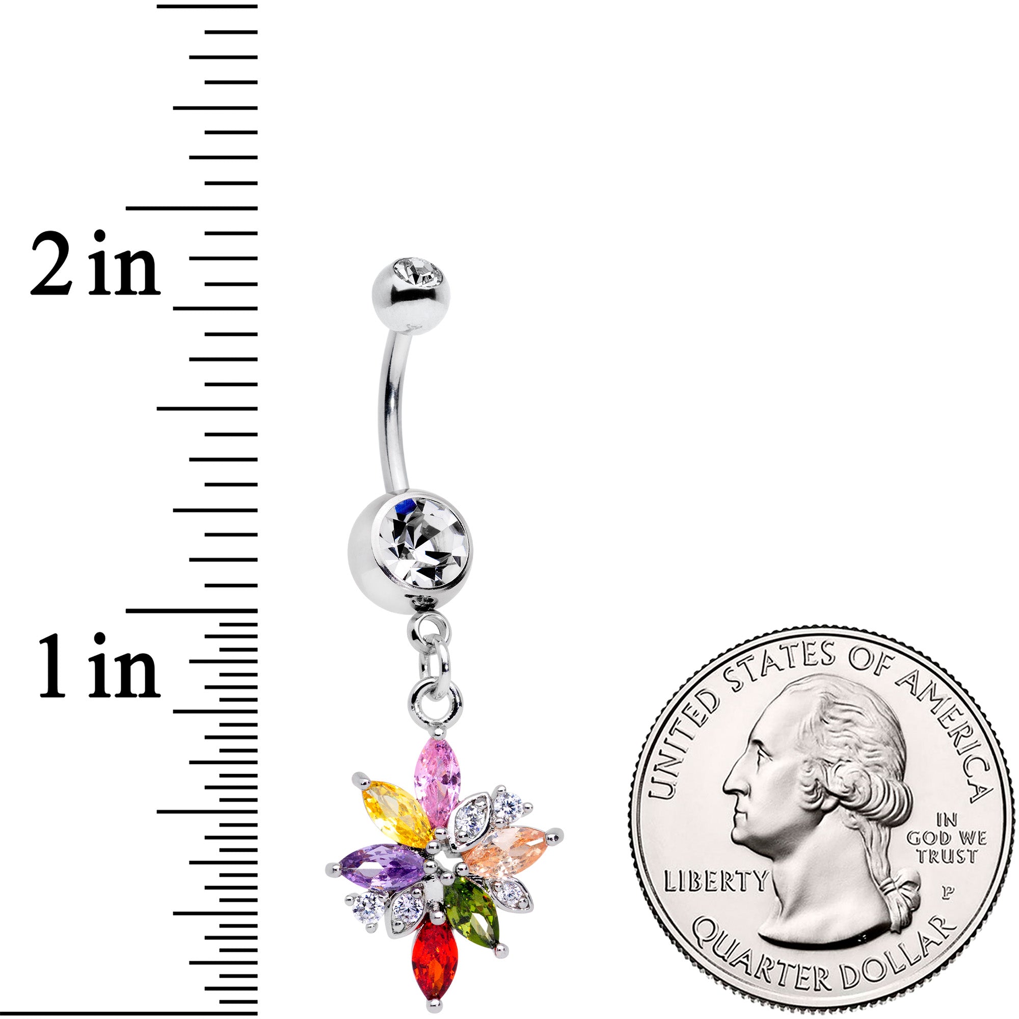 If you like your jewelry to stand out in a crowd, this 14 gauge navel ring is sure to please! It's made with a 3/8" durable 316L surgical grade stainless steel curved barbell. The 5mm top ball end is set with a clear gem, as is the 8mm bottom ball end. Dangling beneath is a large cluster of gems in an array of colors - red, yellow, blue, purple, pink, and clear. This belly button jewelry is sure to get noticed!