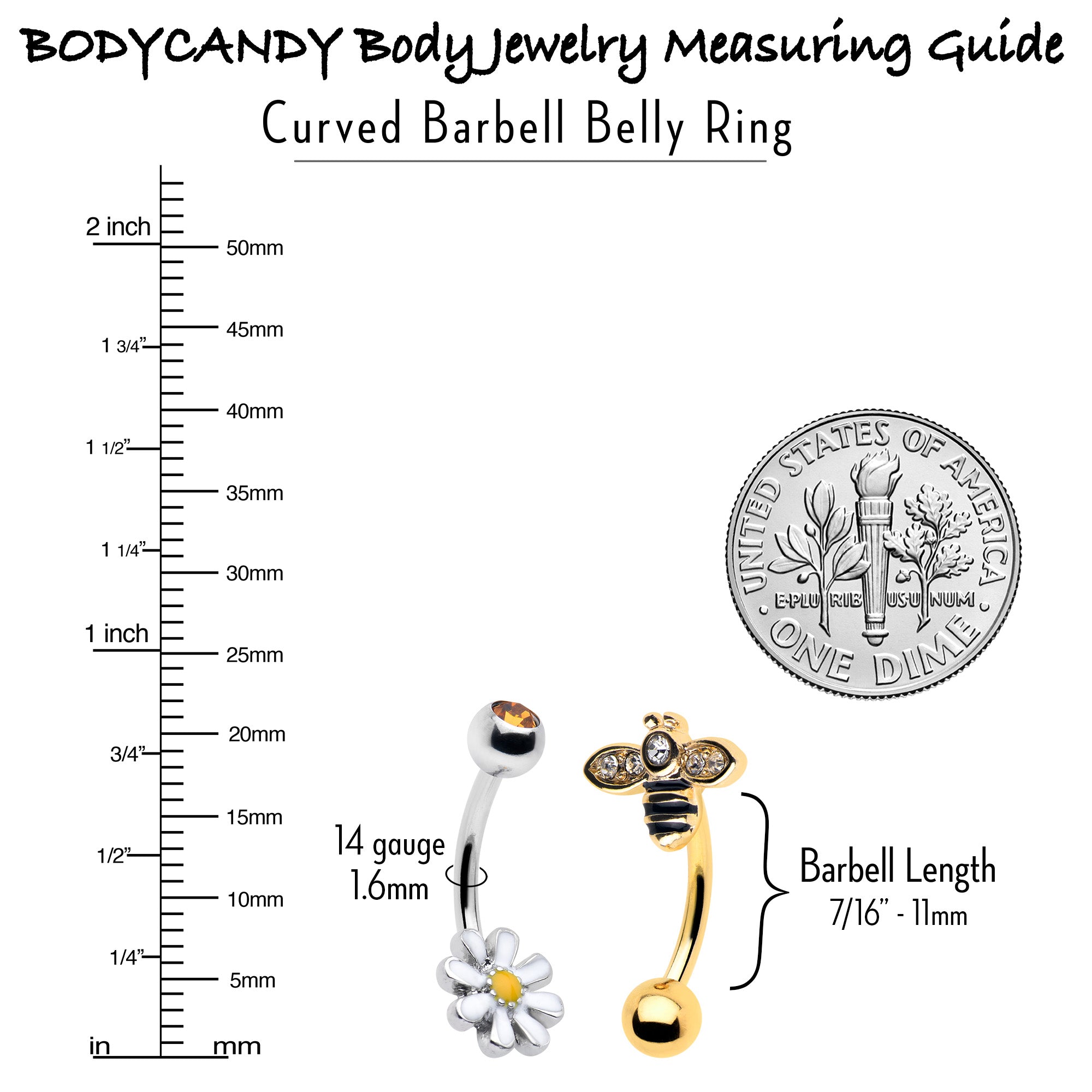 You will have some blossoming style options with this set of 14 gauge navel rings. Two are made with 3/8 inch 316L surgical grade stainless steel curved barbells. One is simply styled and unadorned, with a 5mm top ball end and 8mm and bottom ball end. The other features a 5mm top ball end that is set with a yellow gem, and a bottom end featuring a daisy flower charm. The other two are made with 3/8 inch gold tone plated over 316L surgical grade stainless steel curved barbells. One features simple style, with a 5mm top ball end and 8mm bottom ball end. The other features a 5mm bottom ball end, and a bee charm top that is embellished with clear gems and black stripes. Catch a buzz of beauty with these understated and stylish belly piercing rings. Sold as a set of four.