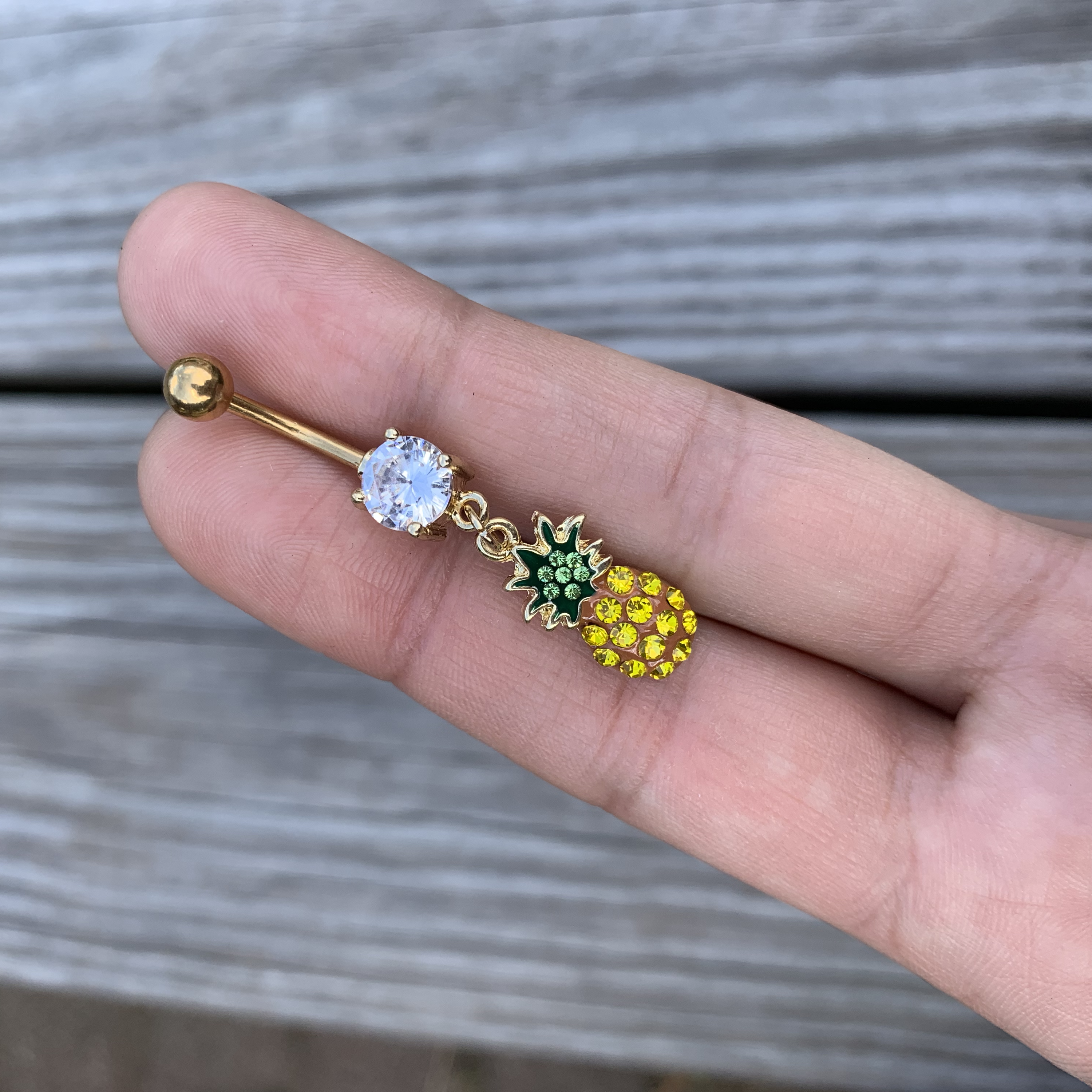 This 14 gauge navel ring is downright delicious! It's made with a 7/16" gold tone plated over 316L surgical grade stainless steel curved barbell and has a 5mm top ball end. The bottom end is a large clear gem. Dangling from the bottom is a charm of a pineapple with green leaves and yellow fruit. It's set with green and yellow gems for a look that's as luxe as it is luscious. This fabulous fruit is sure to look sweet in your navel piercing!