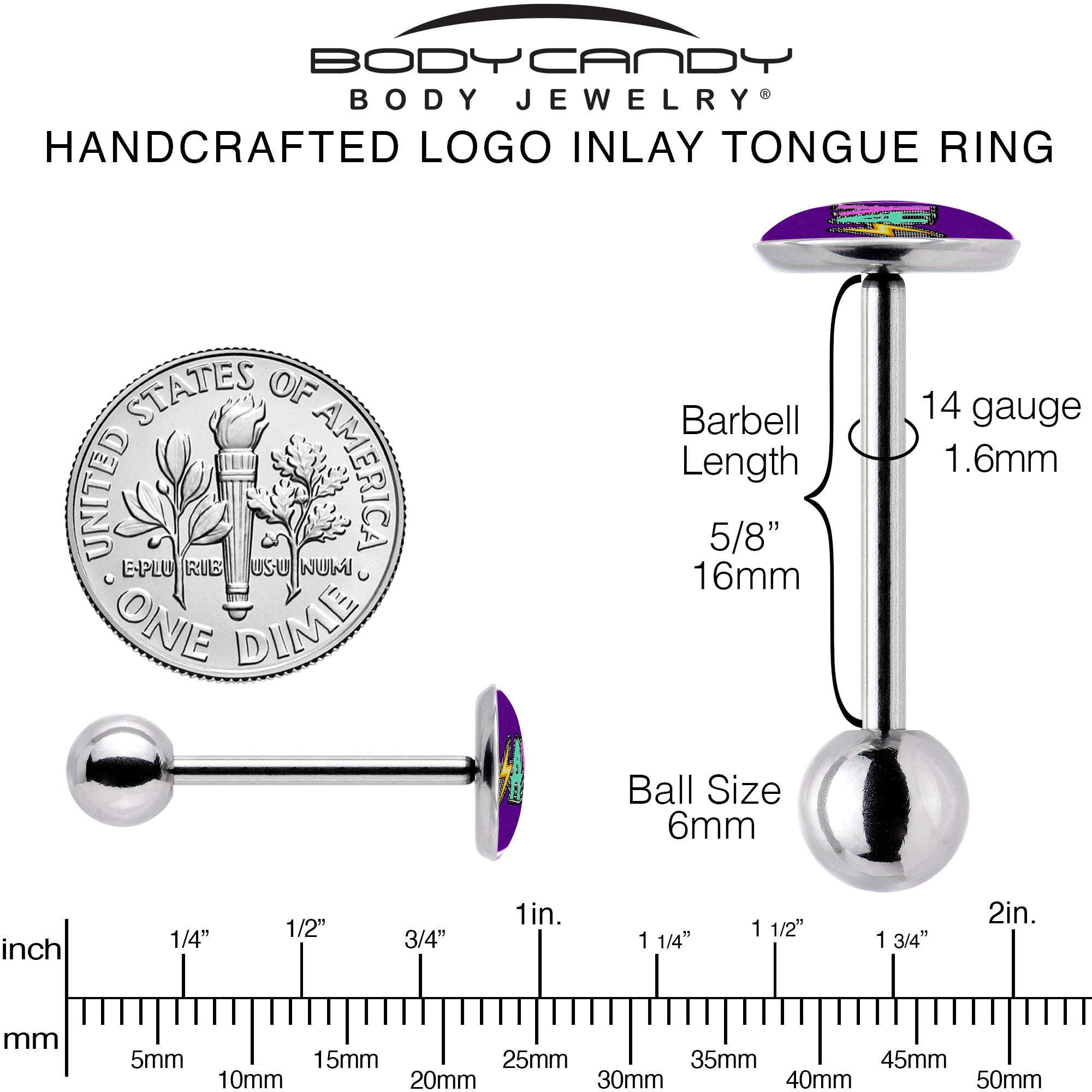 Get ready to kill em with style when you're rocking this 14 gauge tongue barbell. It's made with a 5/8 inch 316L surgical grade stainless steel straight barbell with a 6mm bottom ball end. The top end features a purple logo disc charm with the word Slay on it. The letters are red, green, and purple and the L is composed of a yellow lightning bolt, giving the overall look of seriously colorful rocker style. Get a look that will slay for sure with this sassy tongue piercing jewelry.