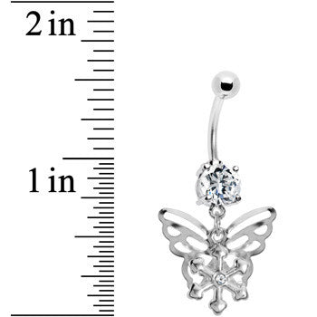 Attention will be directed your way with this encompassing arrow butterfly belly ring. Stainless steel prong-set gem belly ring.