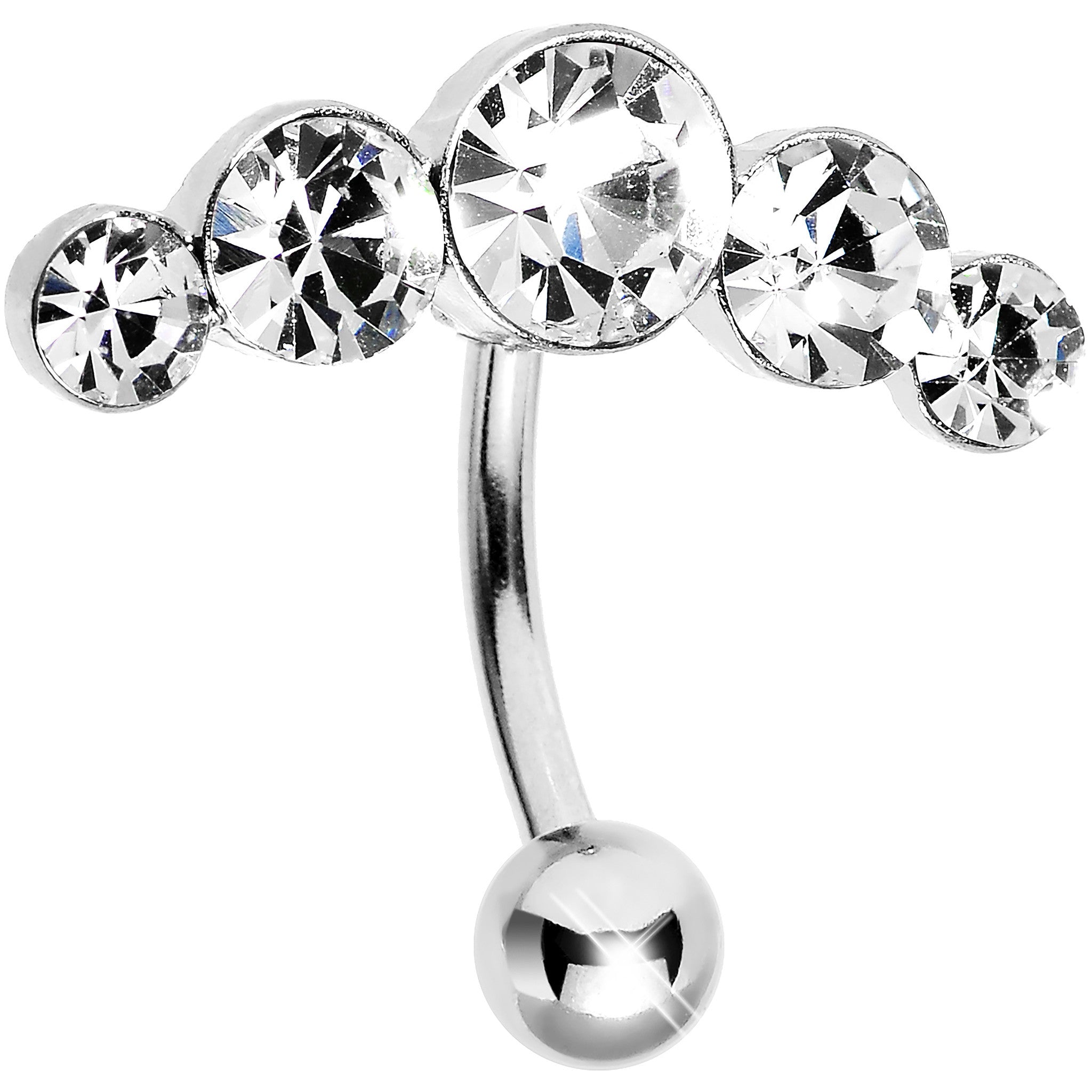This ascending gem belly ring is the perfect blend of glamour and simplicity. Five gem navel ring in shining surgical steel. Curved barbell gem belly jewelry.