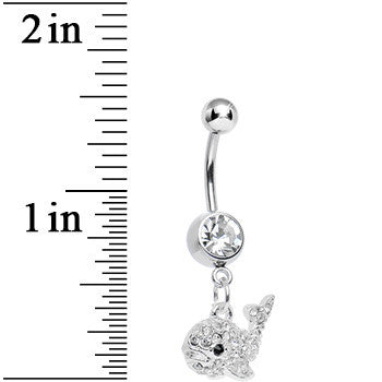 Happy is the whale who is also a sparkling belly button ring. This cute little guy is fashioned from clear gems and a black gem eye and dangles from a classic curved barbell. Animal ocean themed pierced navel Body Jewelry./P>