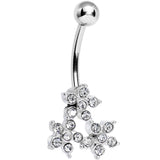A plethora of pretty posies creates a lot of shine on this clear gem belly button ring, just in time for spring and summer sun. Three sweet flowers cluster in a triangle shape and will delight anyone addicted to sparkling daisies on navel rings.