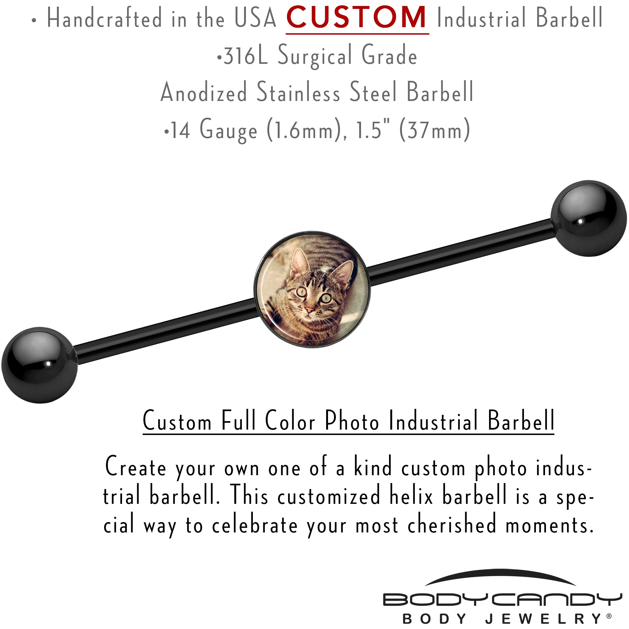 Create your own one of a kind custom photo industrial barbell. This customized helix barbell is a special way to celebrate your most cherished moments.