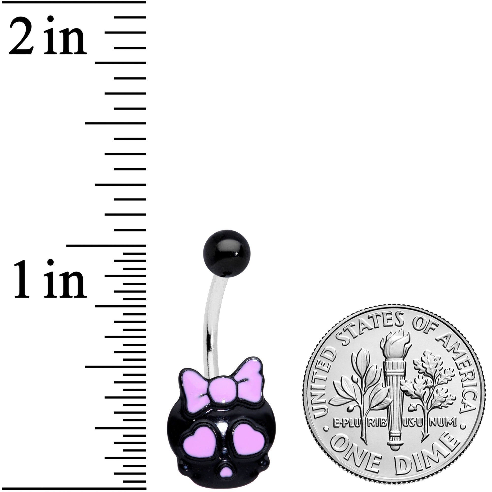 The skull on this 14 gauge navel ring is a total sweetie! It's made with a 7/16" durable 316L surgical grade stainless steel curved barbell with a black 5mm top ball end. The bottom end features a black skull charm. The skull features a pink bow on its head and matching pink heart-shaped eyes for a look that transforms it from creepy to cute. Take your navel piercing from "alarming" to "adorable" with this cute and captivating skull belly button ring!