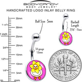 Hide yourself in fabulous floral beauty like the duck on this 14 gauge navel ring. It is made with a 7/16 inch 316L surgical grade stainless steel curved barbell with a 5mm top ball end. The bottom end features a pink disc with a duck on it. The duck is wearing a daffodil flower blossom as a hat, as though trying to disguise itself as a flower. You will be ready to blossom too with this daffy, darling duck belly piercing jewelry.
