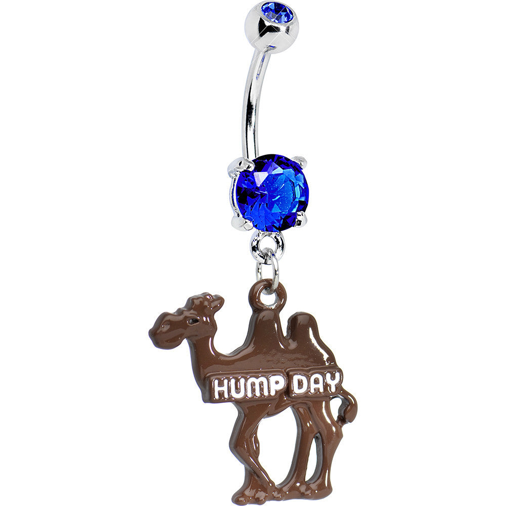 Guess what day it is? This goofy belly ring features a kooky camel charm emblazoned with the words "HUMP DAY." Charm dangles from double blue gem barbell. Camel hump day belly button ring.