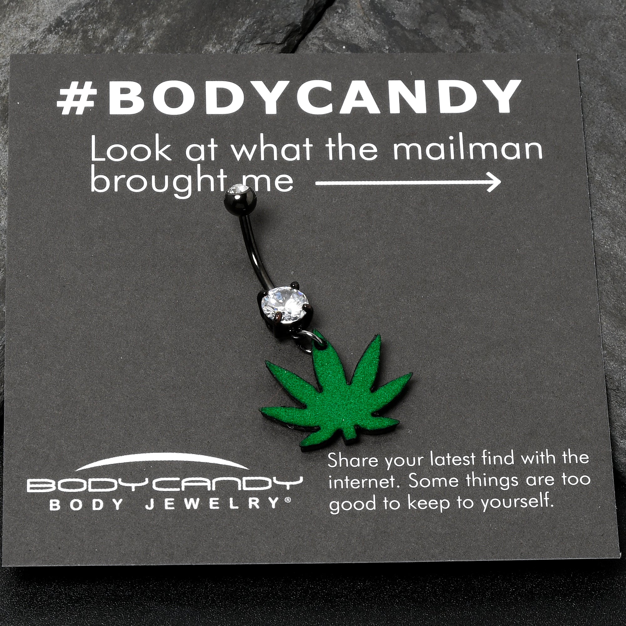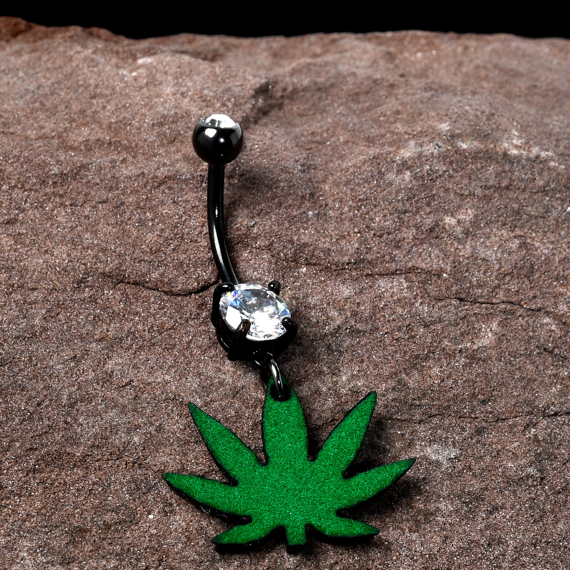 Double Gem Green Marijuana Pot Leaf Black Dangle Belly Ring