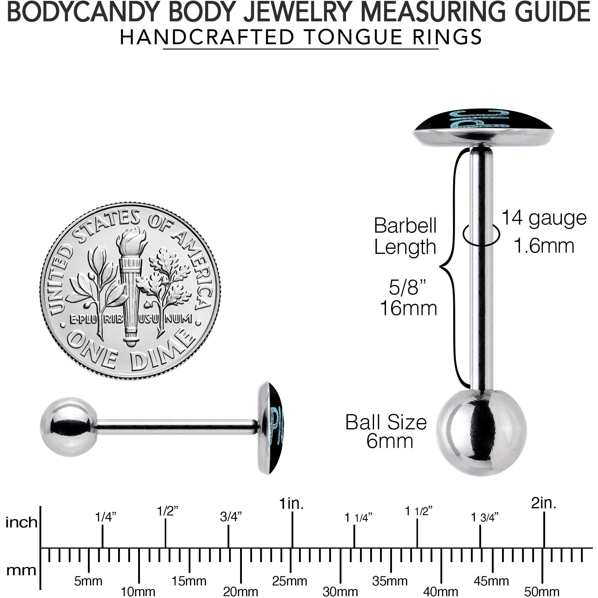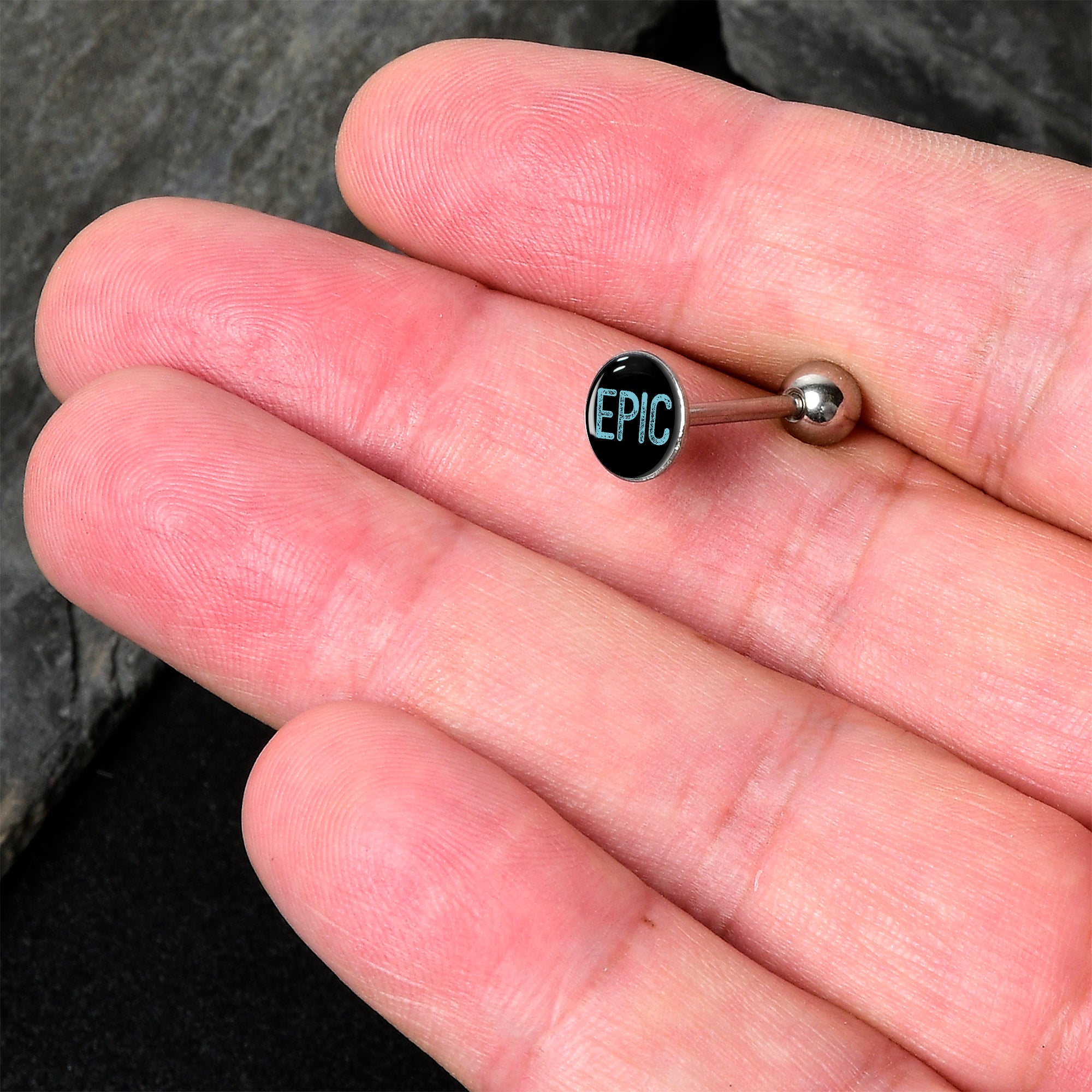 Some things are better than great, they are truly epic - as seen on this 14 gauge tongue jewelry. It is made with a 5/8 inch 316L surgical grade stainless steel straight barbell with a 5mm bottom ball end. The top end features a black, disc shaped charm. It features the word epic, in blue, all capital letters. If you are brimming over with love about something truly amazing, spread the word with this thoroughly epic tongue piercing ring.