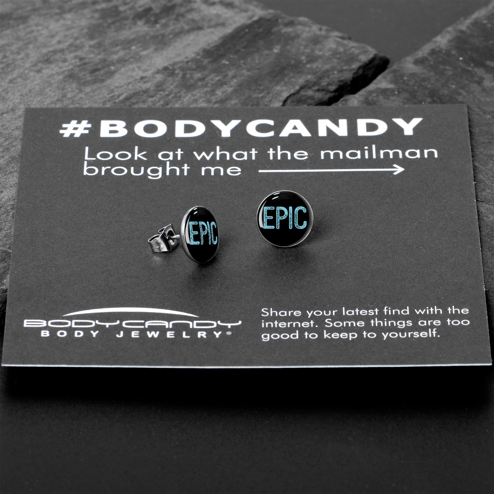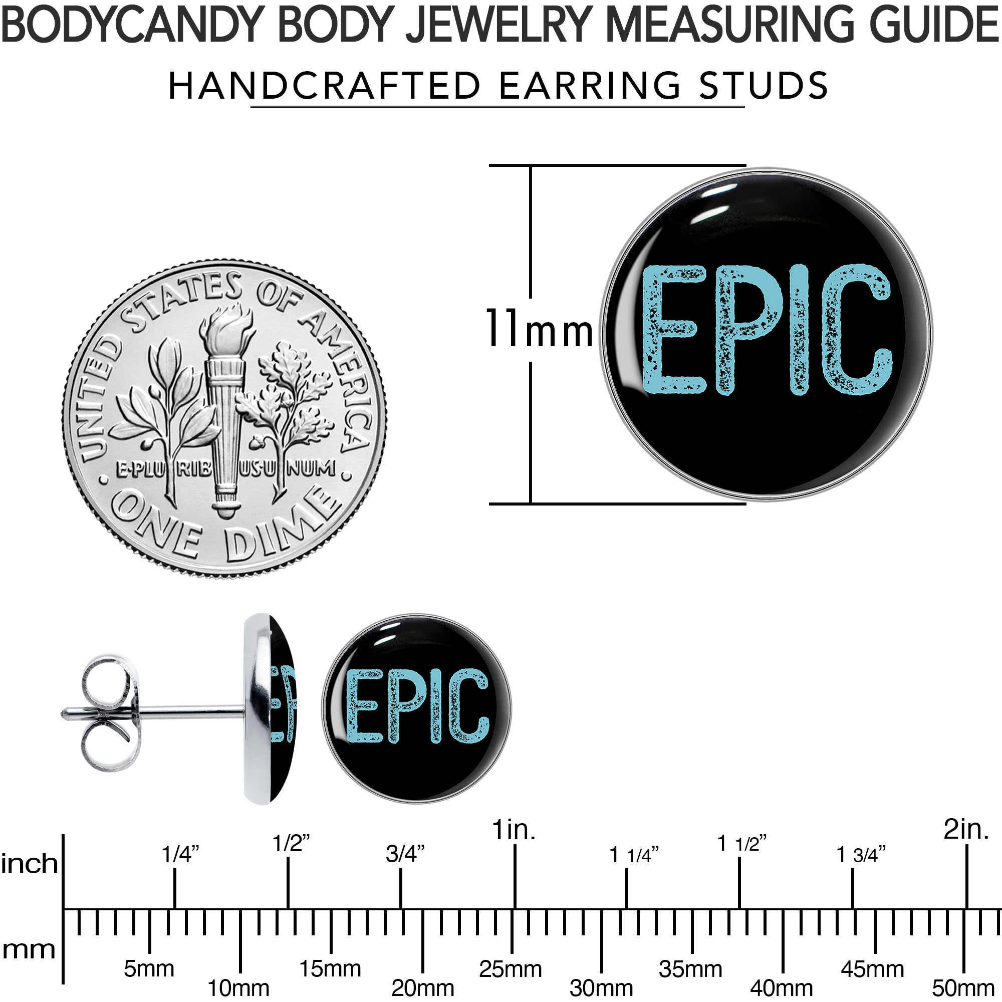 Some things are better than great, they are truly epic - as seen on these earrings for pierced lobes. They are made with stainless steel straight posts with friction backs for a secure fit. The front end each features a black, disc shaped charm. They feature the word epic, in blue, all capital letters. If you are brimming over with love about something truly amazing, spread the word with these thoroughly epic stud earrings. Sold as a set of two.