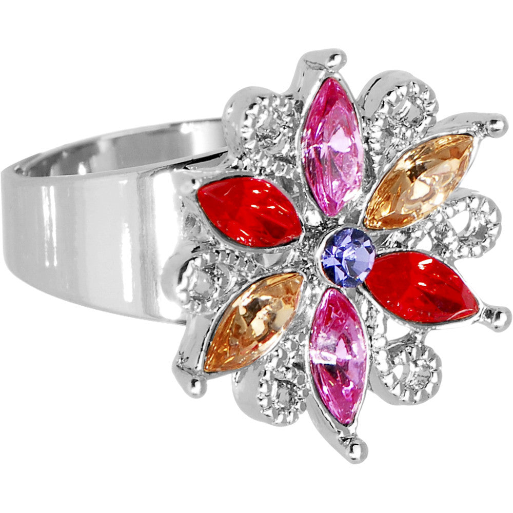 Make any outfit fancy with this jeweled flower ring. Dazzling flower cocktail ring. This adjustable cocktail ring is sure to add a dramatic touch to any look with a feminine floral design.