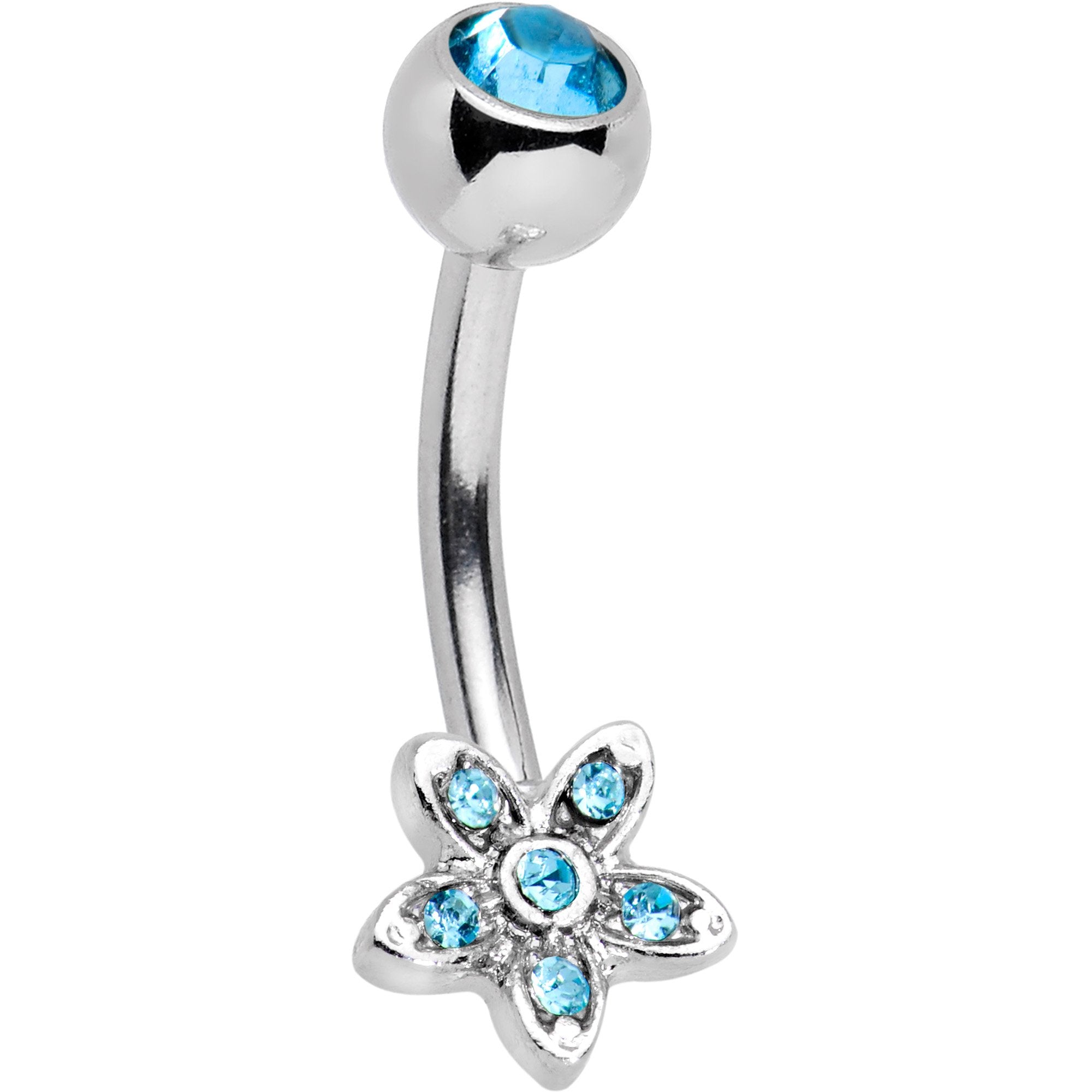 Wow, smell those freshly cut flowers! This beautiful 14 gauge dangle belly ring features a whole field of beautiful flowers! A trio of five petal flowers encrusted with gems is mounted on a 7/16" curved barbell made with durable 316L surgical grade stainless steel complete with a flower charm bottom accent and a top gem. Upgrade your belly button jewelry with this glamorous piercing today!