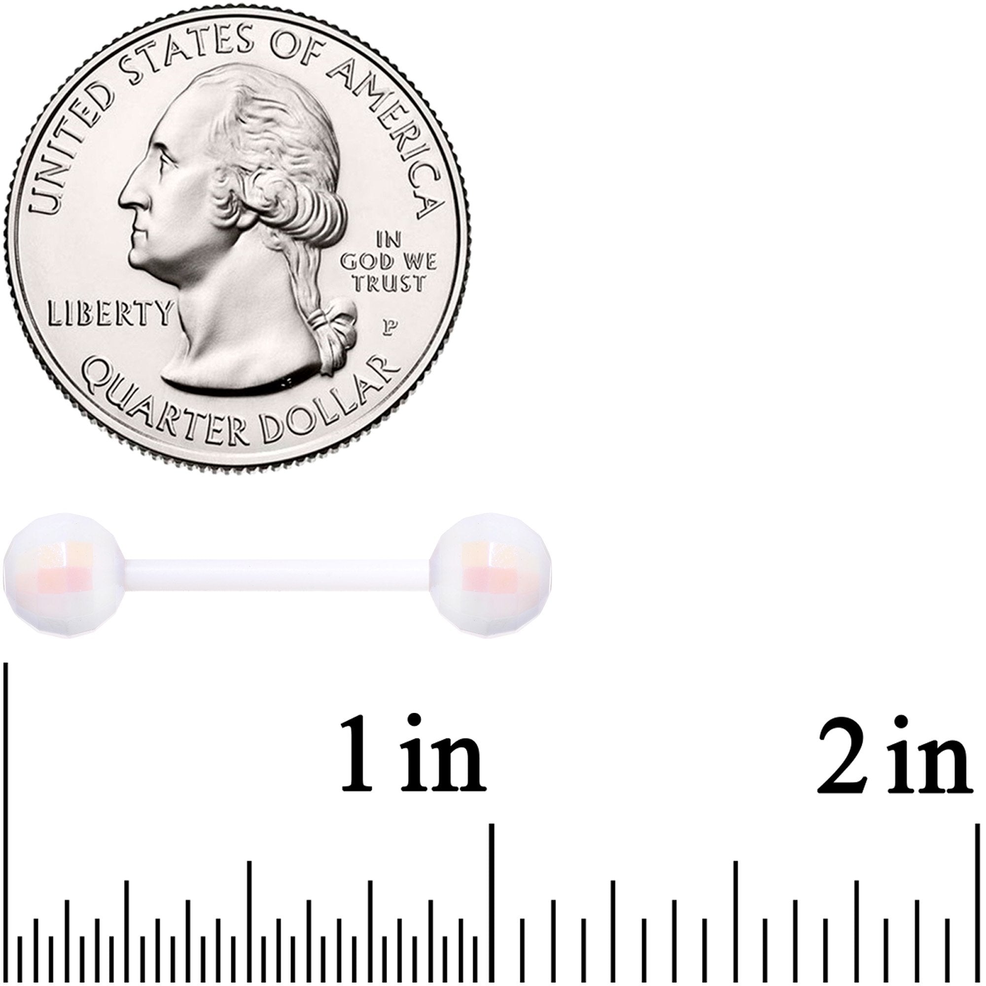 Get ready for some disco dancing with this 14 gauge tongue jewelry! Made with a 16mm white flexible acrylic straight barbell, it has 6mm acrylic ball ends. But these aren't ordinary balls - they're disco balls! The iridescent white ball ends are faceted to reflect the light and show off that iridescent shift, giving your look an undeniable something extra that you won't get anywhere else. Get your platform shoes ready because it's disco time!