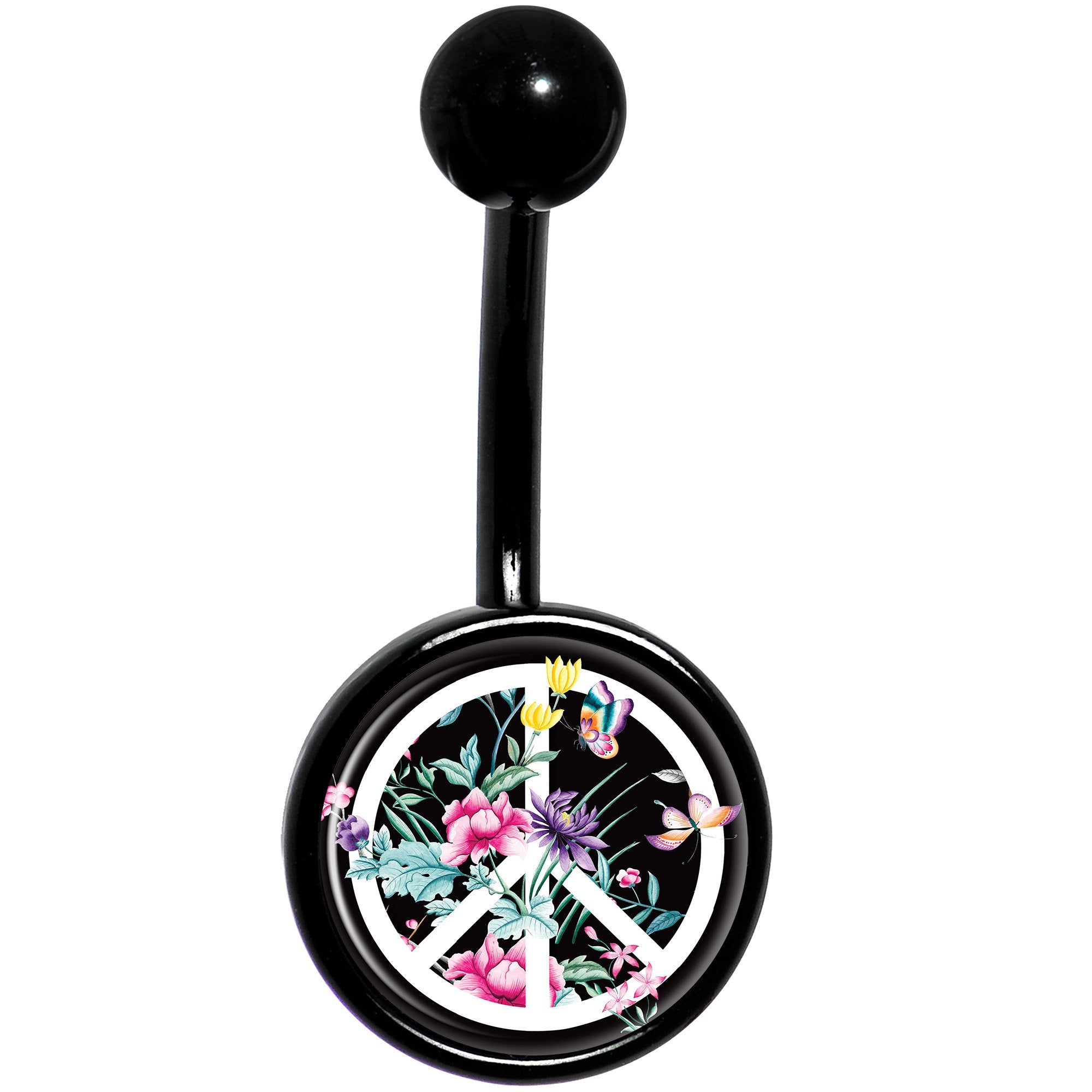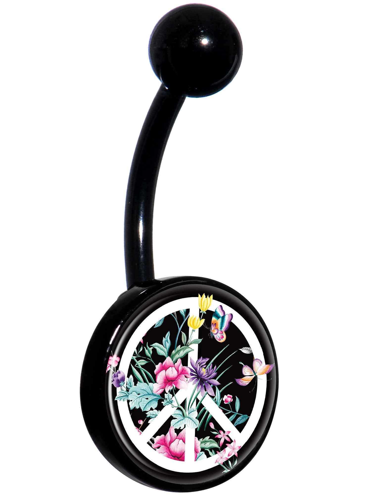 If you lover floral prints and peaceful living then this navel jewelry is right for you! Made with a 7/16" black anodized over 316L surgical grade stainless steel curved barbell, this belly button ring features a white peace sign on black background with flora accents logo inlay.
