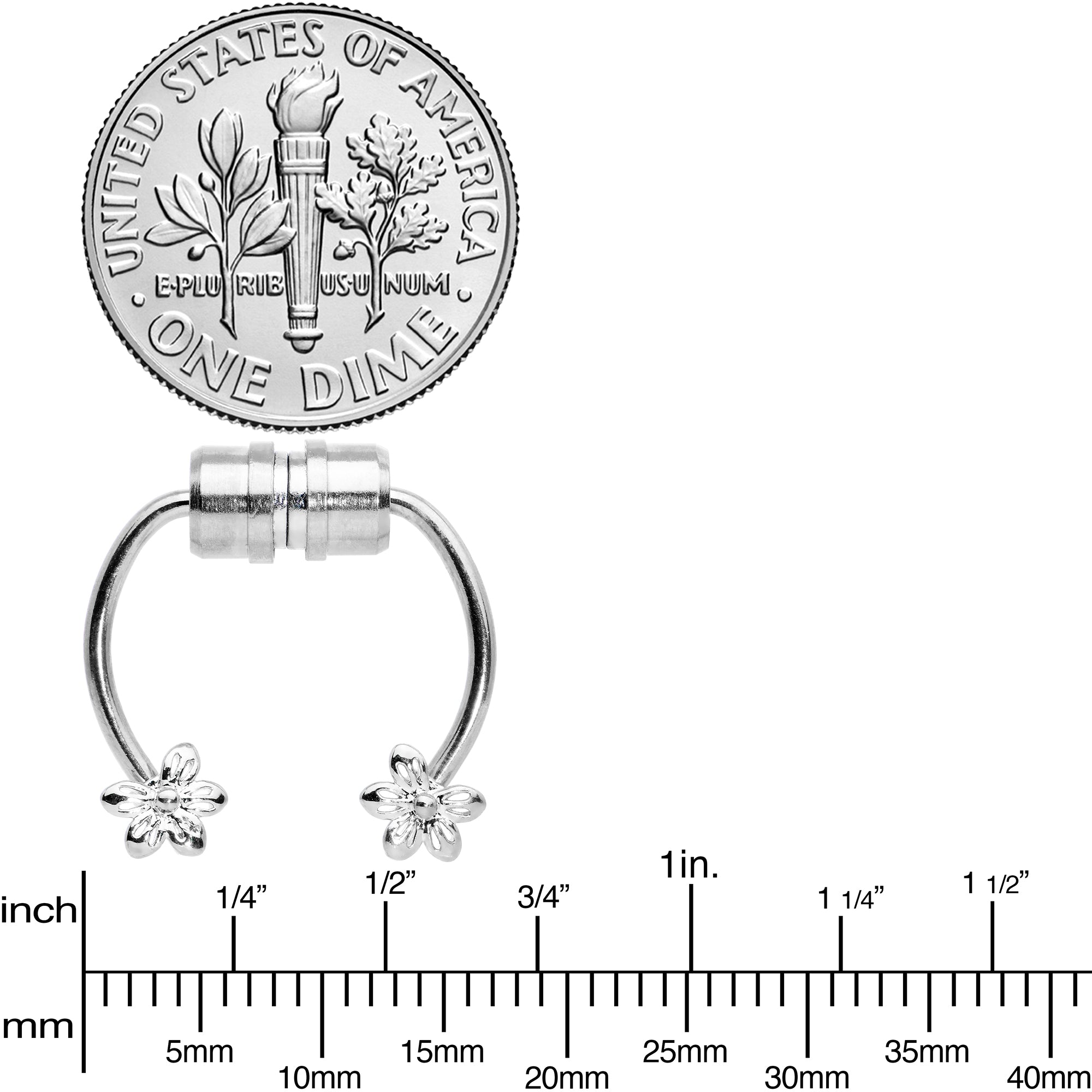 If you like the look but aren't ready to commit yet, this faux septum jewelry is perfect for you! It features a pair of magnets to hold it securely in place without the need of a trip to the piercer. It features flower charm ends for a stylish and elegant look. Try out a new look before you commit with this magnetic faux septum jewelry!