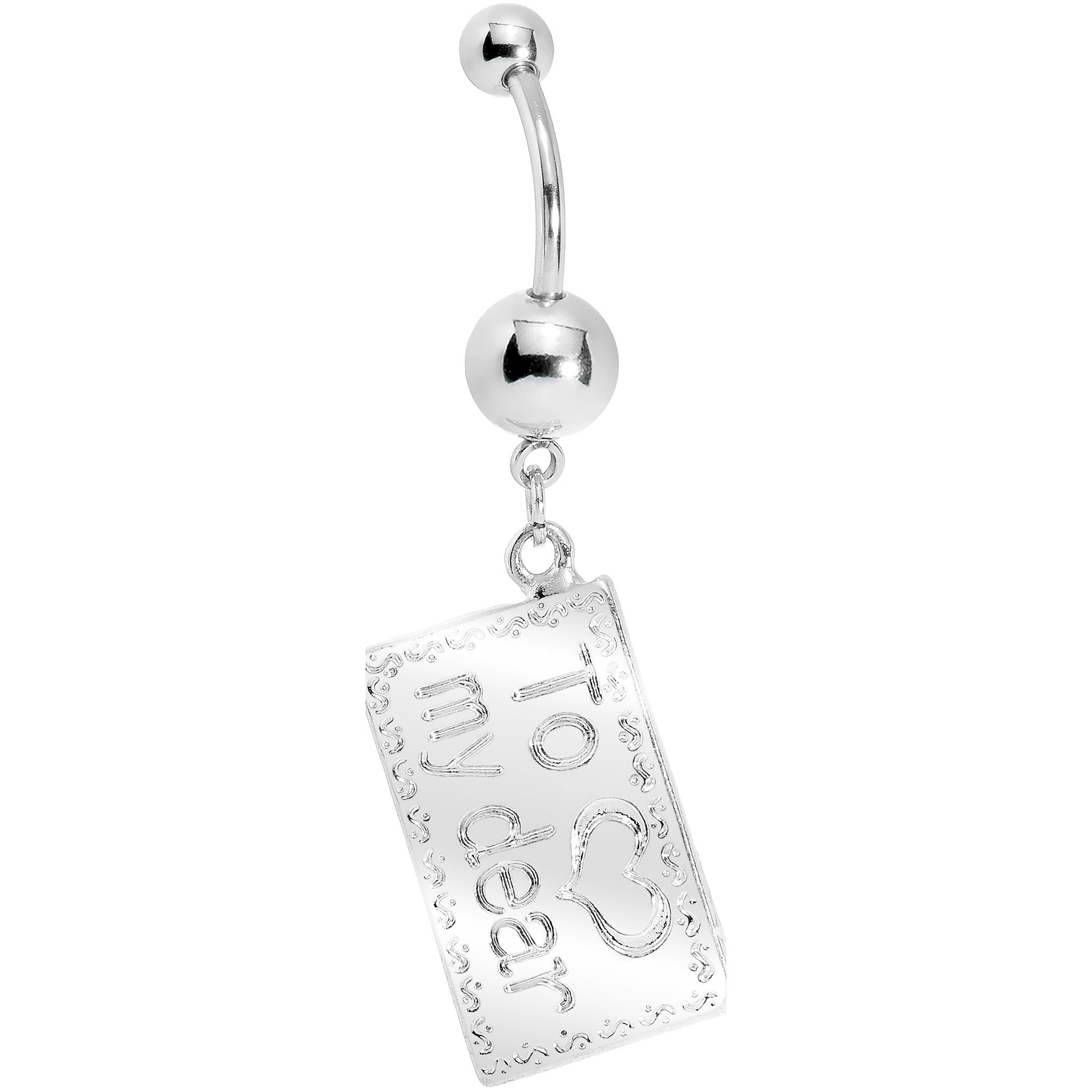 This envelope holds a message of love. Gem belly ring with heart closed envelope charm. Dangle navel ring with gem paved letter. Curved barbell belly jewelry.