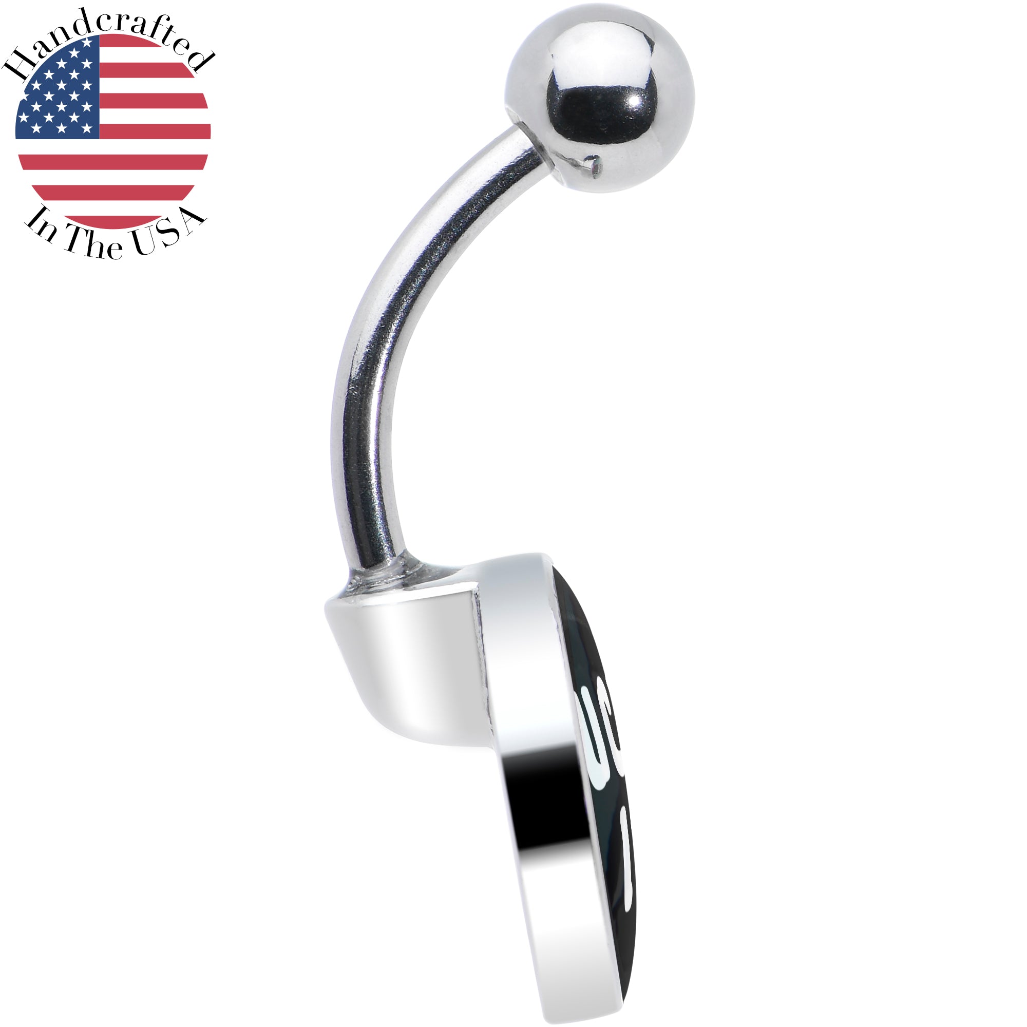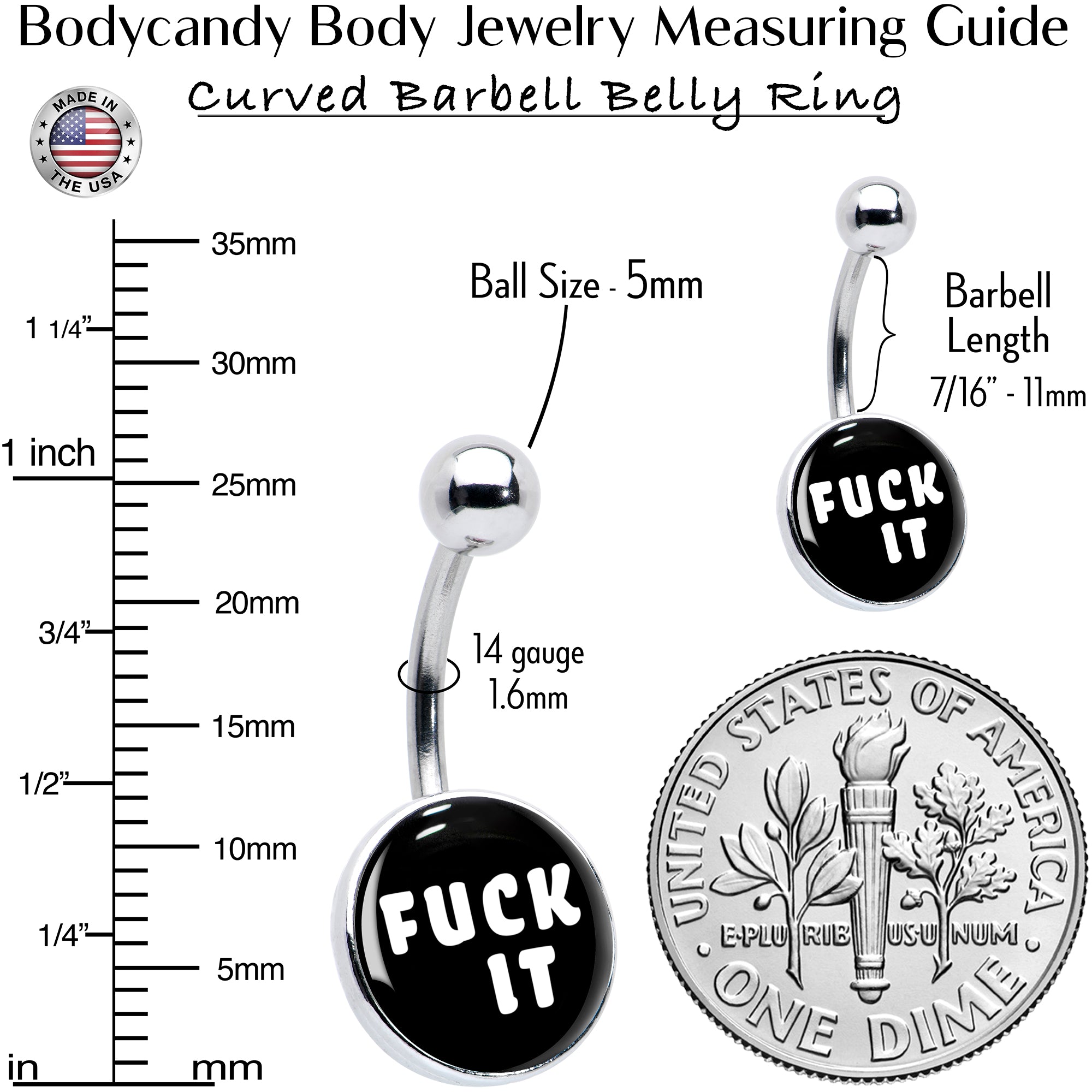 Tell them how you really feel with this 14 gauge navel ring. It is made with a 7/16 inch 316L surgical grade stainless steel curved barbell with a 5mm top ball end. The bottom end features a disc shaped charm that features a logo inlay of a black background with a Fuck It message. Let the world know you have had enough with this charmingly blunt belly piercing ring.