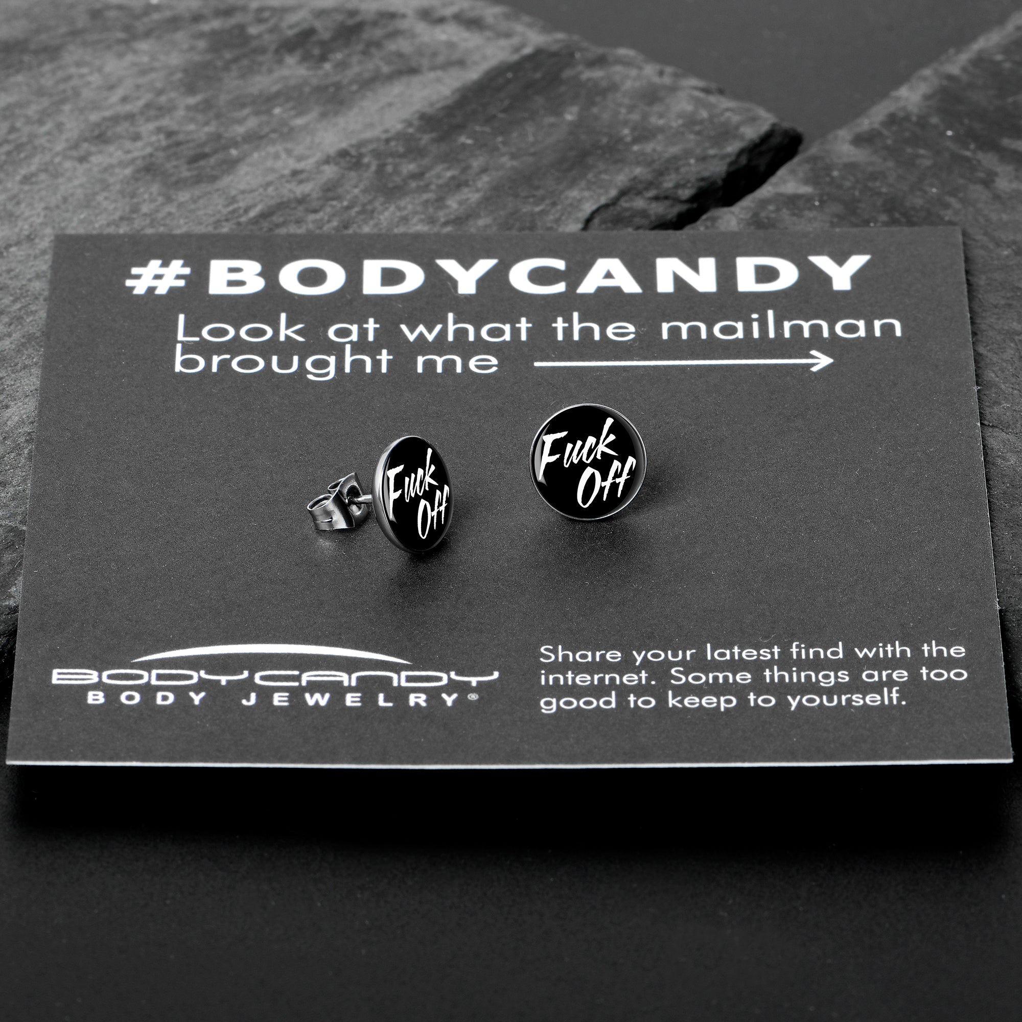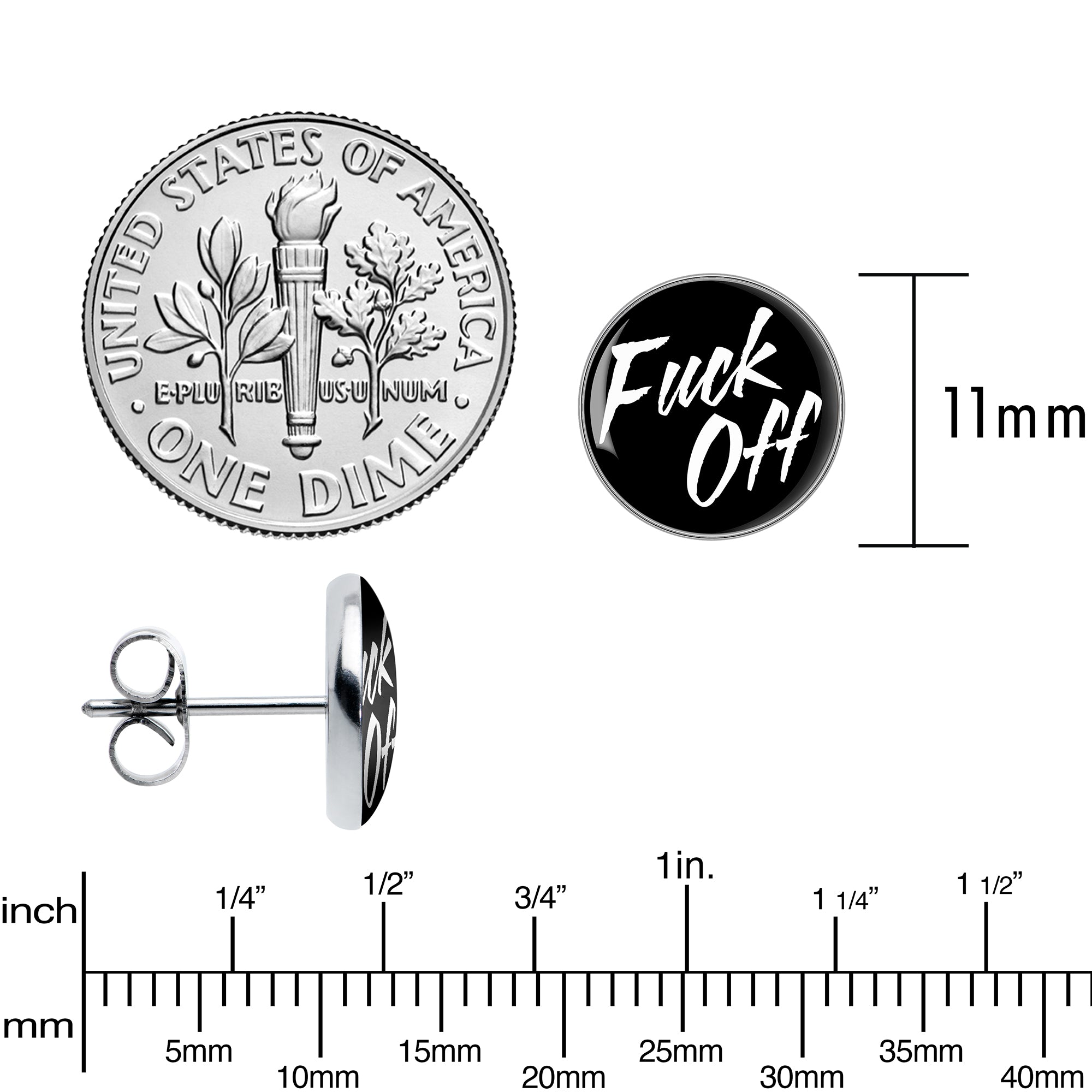 Say what you mean and mean what you say with these stud earrings for pierced ears! They're made with stainless steel straight posts with friction backs for a secure fit. They feature disc shaped charms that feature a logo inlay of a black background with a "Fuck Off" message. Let the world know when to stay away with these charmingly blunt pierced earrings! Sold as a set of two.