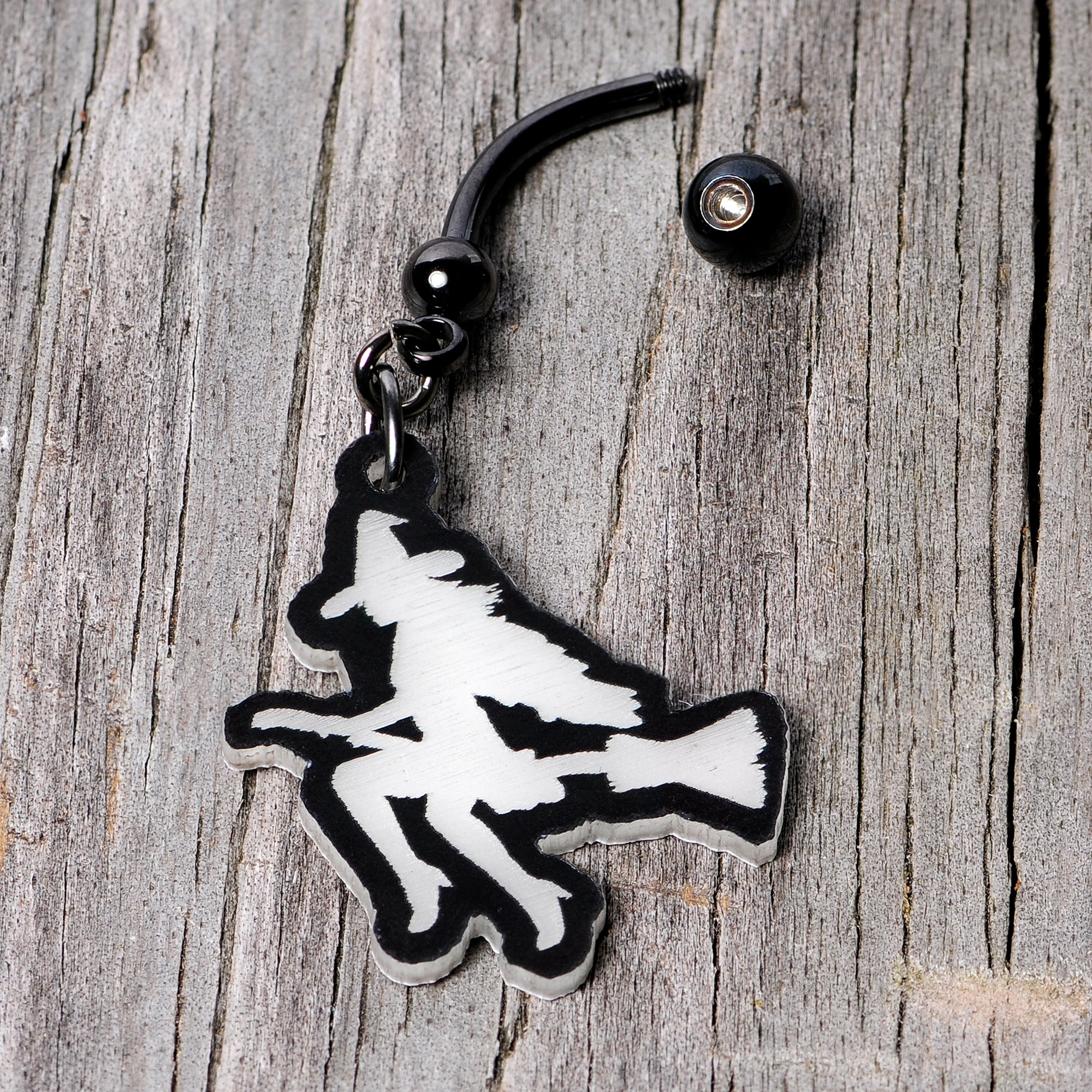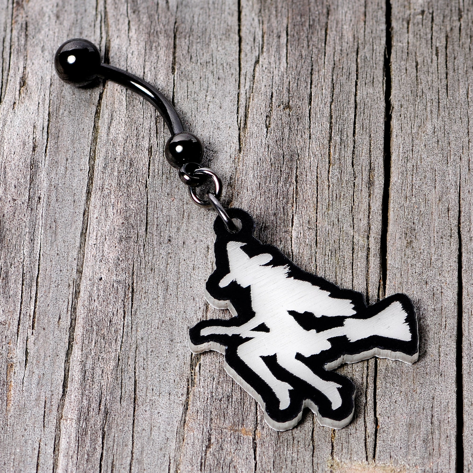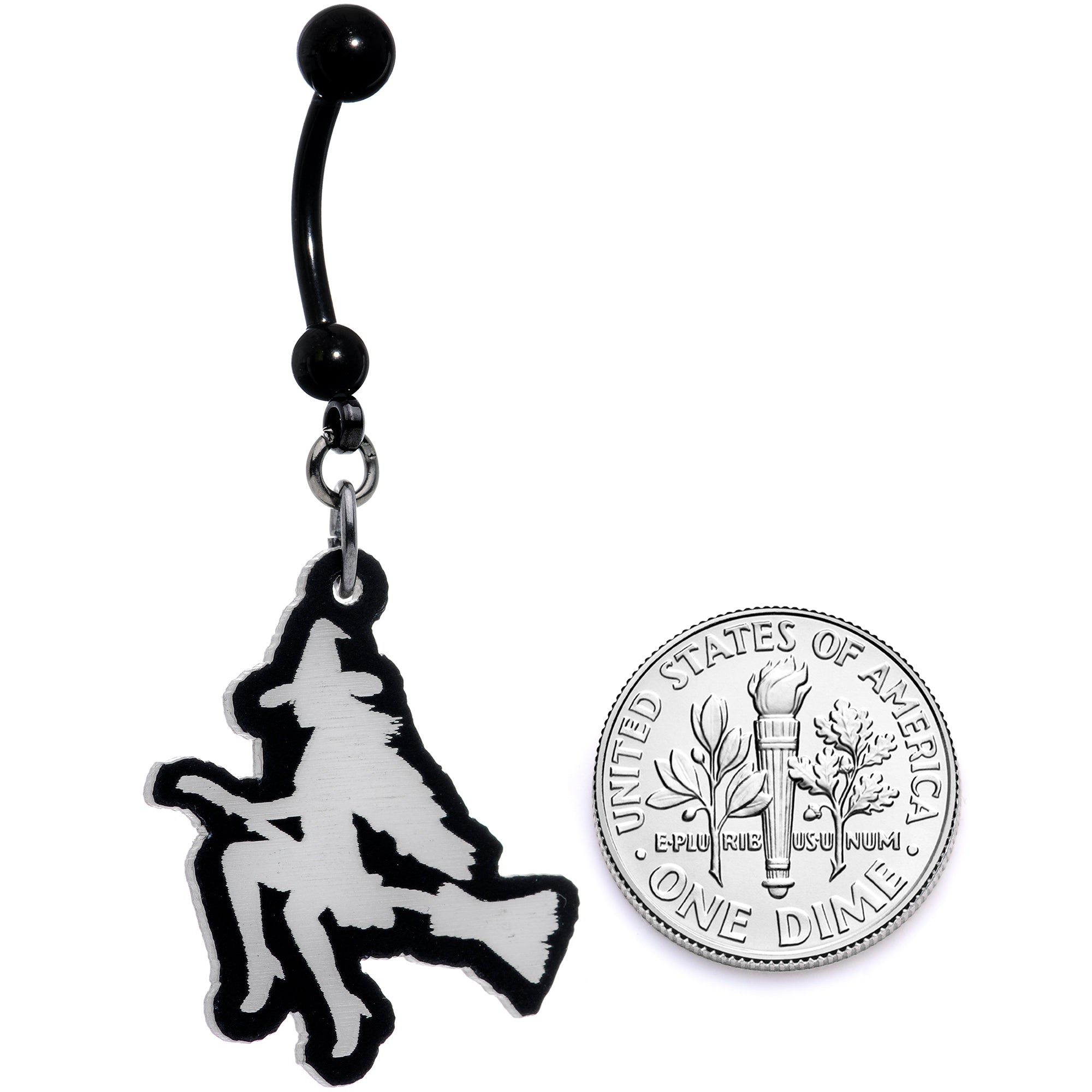 Take off into the night sky with this Halloween witch belly button ring. This witch on broom navel piercing features an anodized titanium over 316L surgical steel curved barbell and glow dangle charm. Glow in the dark belly ring. Halloween body jewelry