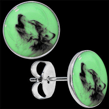 Hypoallergenic jewelry for sensitive skin.You will howl for this eye-catching wolf earrings. Stainless steel stud post earrings with logo inlay. Glow in the dark earrings will light up your night.