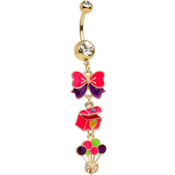 Hypoallergenic jewelry for sensitive skinBring the spirit of Christmas to your navel piercing with this dangle belly ring featuring festive charms that will bring joy to any Scrooge. The gold plated over 316L surgical grade stainless steel curved barbell includes ball ends containing clear highlights, and the dangling charms of a bow, treasure chest, and delectable lollipops offer their fair bit of sparkle as well.
