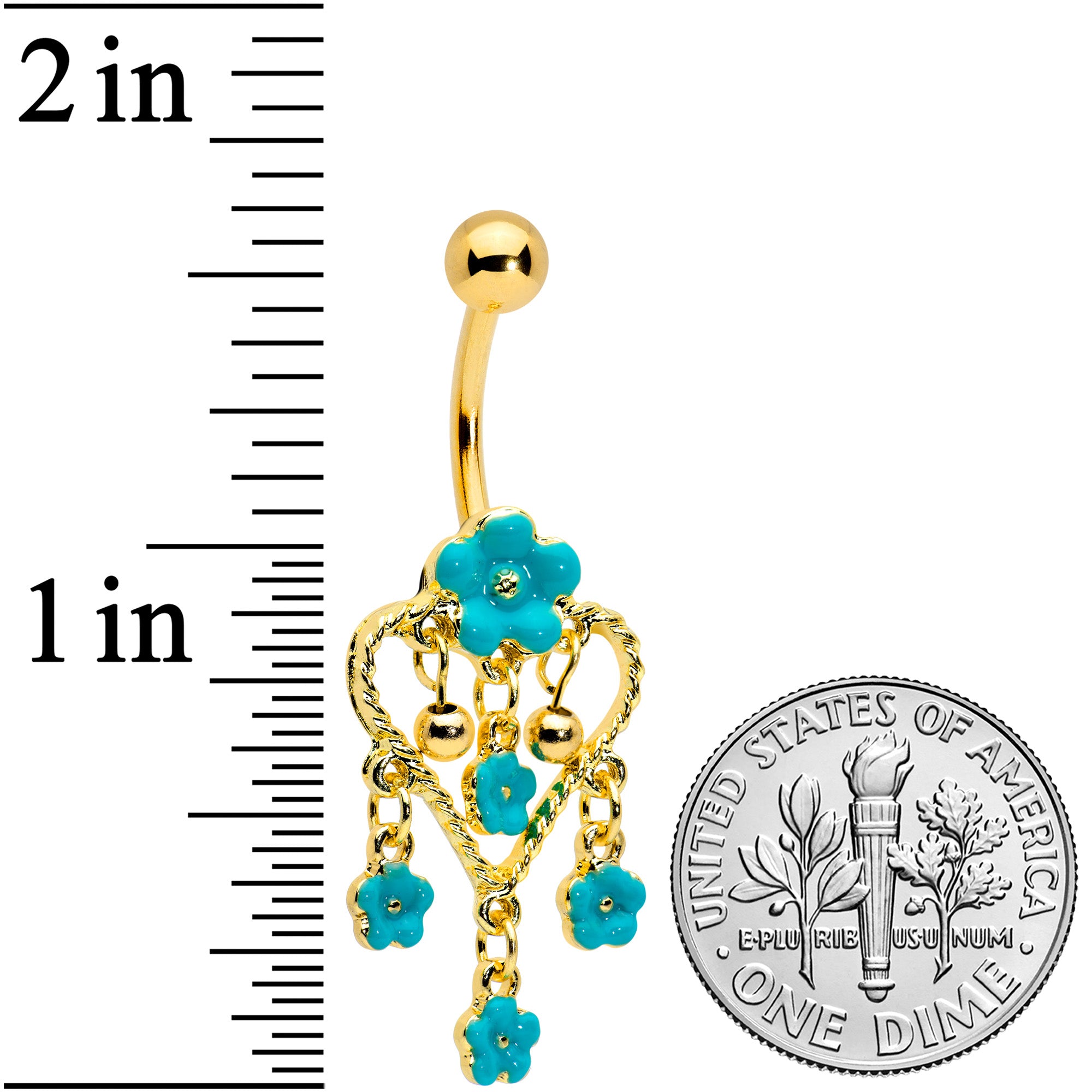 If you're all hearts and flowers or you're singing the blues, this 14 gauge navel ring is perfect for you! It's made with a 3/8" gold tone plated over 316L surgical grade stainless steel curved barbell with a 5mm top ball end. The bottom end is a large, openwork heart with filigree detailing. It features a large blue flower at the top with multi-dimensional detailing. The heart is further embellished with another blue flower beneath it, as well as three more matching flowers dangling from the bottom. If your mood is blue or your heart is blooming with love, this belly button ring will have you covered.
