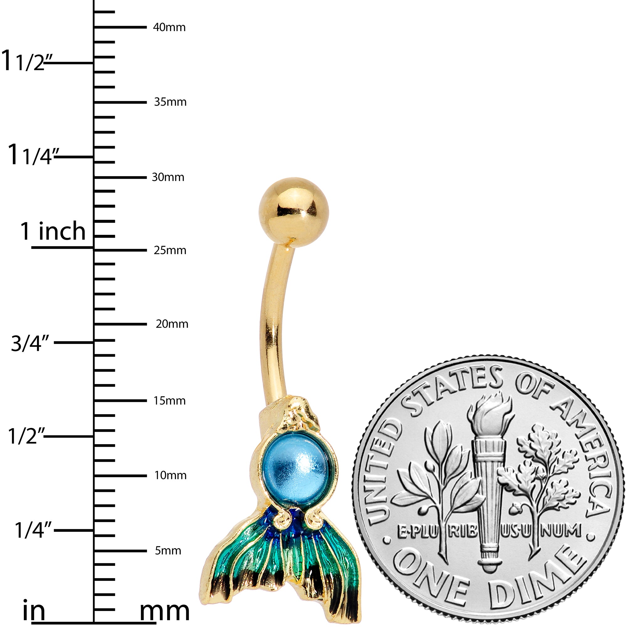 Some generous mermaid seems to have donated her tail to this nautically-themed 14 gauge navel jewelry. It's made with a 3/8" gold tone PVD over 316L surgical grade stainless steel curved barbell with a 5mm top ball end. The bottom end features a translucent blue orb with a mermaid tail charm in deep green. Whether or not you live near the ocean, get a little tail with this marvelous mermaid belly jewelry!
