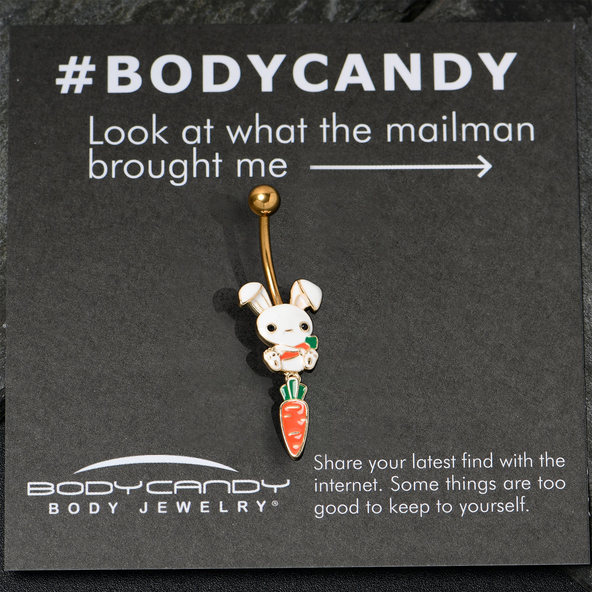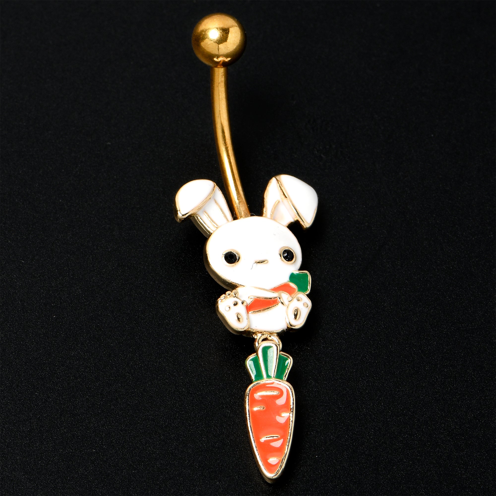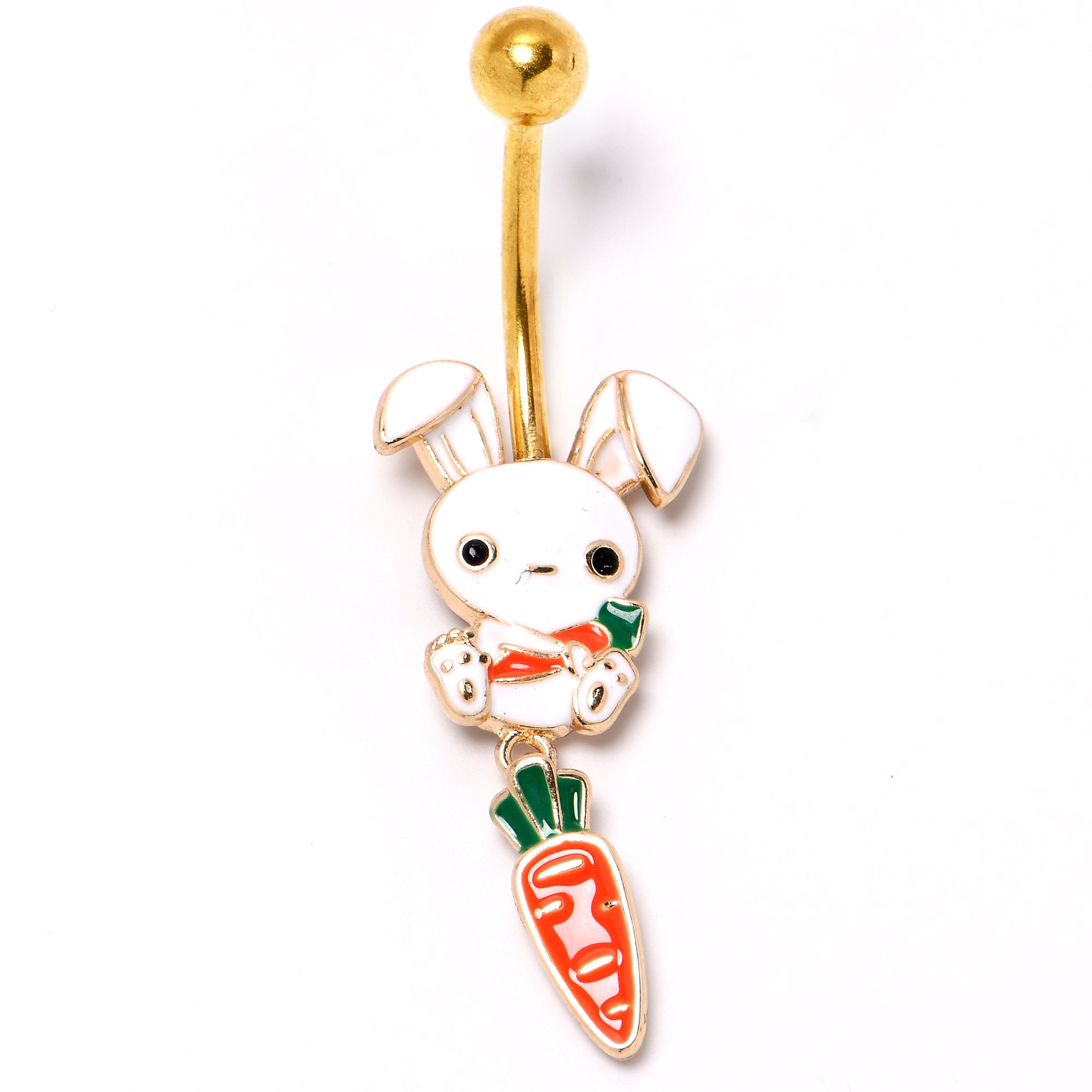 The Easter Bunny on this 14 gauge navel ring is quite the little cutie. It is made with a 3/8 inch gold tone PVD over 316L surgical grade stainless steel curved barbell with a 5mm top ball end. The bottom end features an Easter Bunny charm, with the bunny cradling a carrot. It also features a dangling carrot charm for a cohesive and eye catching look. The bunny on this belly piercing ring is one you will want hanging around all year long.