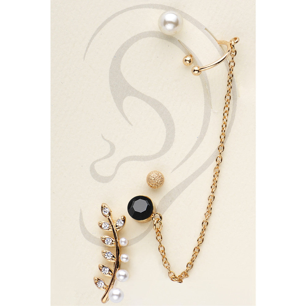 This set of earrings will be sure to dazzle your lobes with the many different style options that are included. Three individual stud earrings are included along with an 18 gauge horseshoe circular barbell for your cartilage that is attached to a 3" chain, which flows down to connect to black bezel set stud earring. This unique set of ear accessories have rhodium plated posts and are great for a fashionista with a desire for variety.