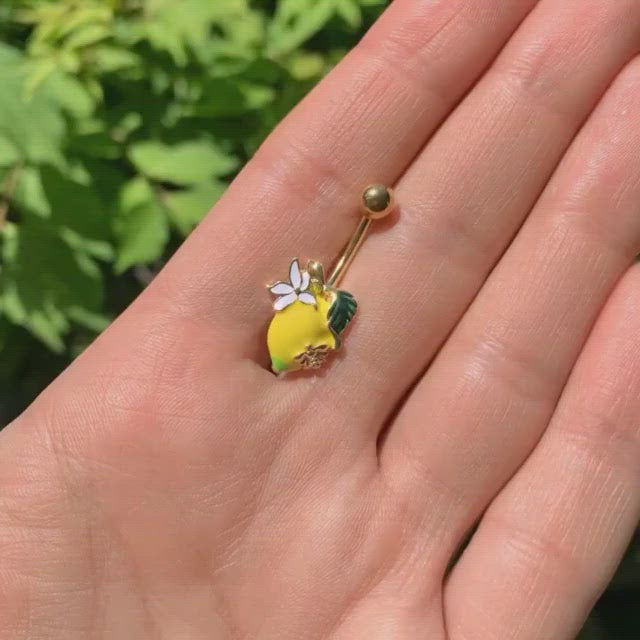 When life gives you a lemon....wear it in your belly piercing with this 14 gauge navel ring! It's made with a 3/8" gold tone PVD over 316L surgical grade stainless steel curved barbell with a 5mm top ball end. The bottom end features a bright yellow lemon charm with small white flower and a tiny bee. You won't have any reason to be a sourpuss with this lovely lemon belly ring!