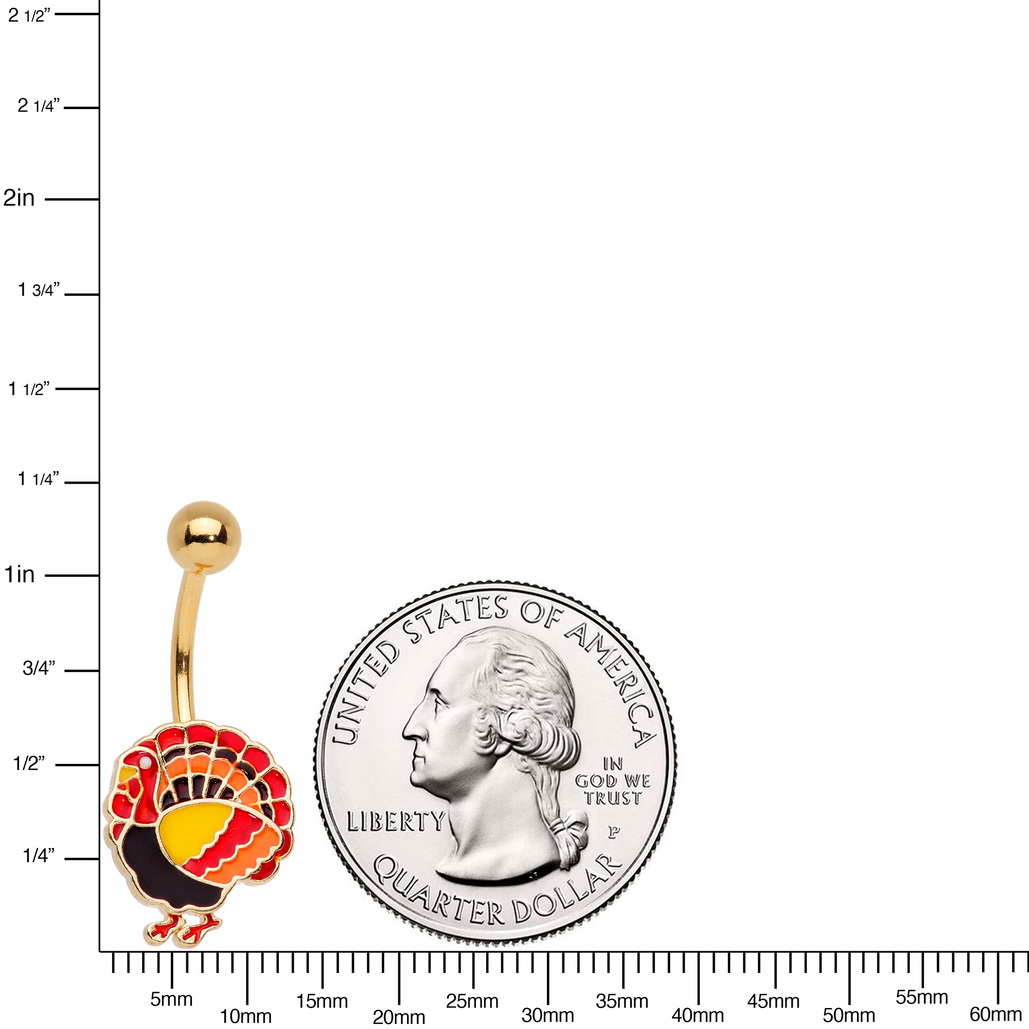 If you can't wait to gobble up some turkey this Thanksgiving then you will love this pretty 14 gauge belly button ring with holiday style! Made with a gold tone PVD over 316L surgical grade stainless steel curved barbell, this belly button ring features a full color Thanksgiving turkey charm that you will love! Thanksgiving body jewelry.