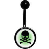 If you love the color green and scary Halloween skull and crossbones then this 14 gauge belly button ring is right for you! Made with a 7/16" black anodized over 316L surgical grade stainless steel curved barbell, this navel ring features a logo inlay bottom charm.