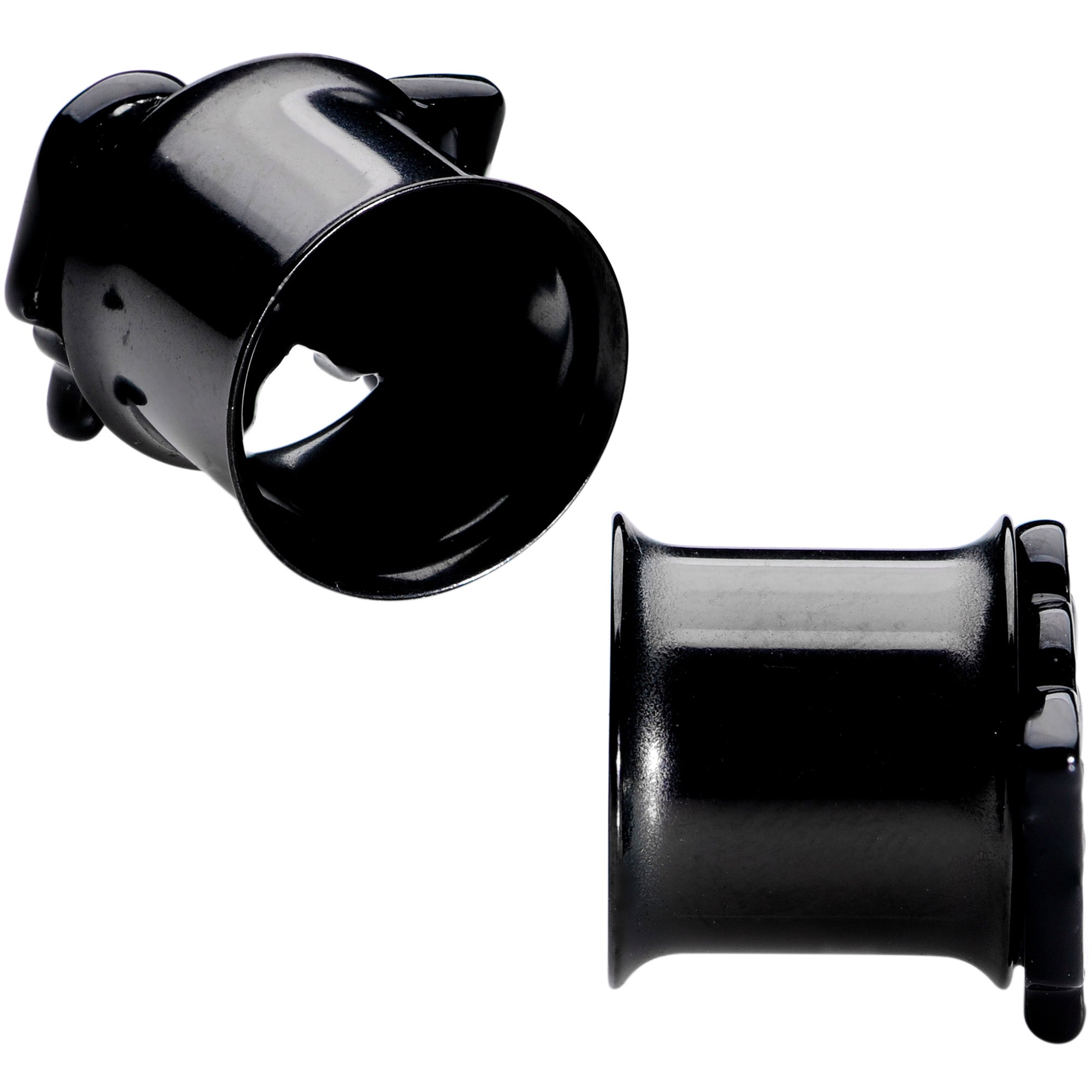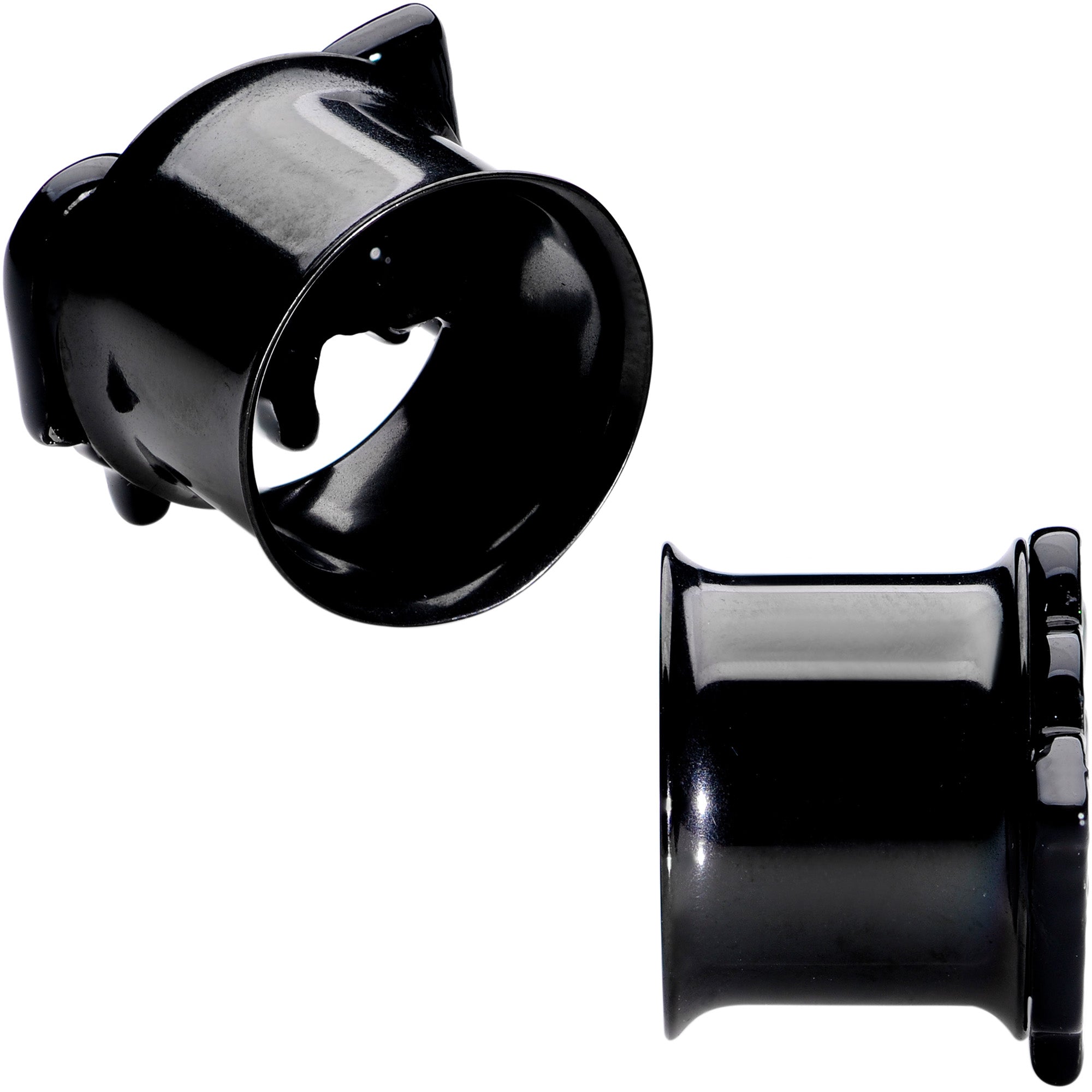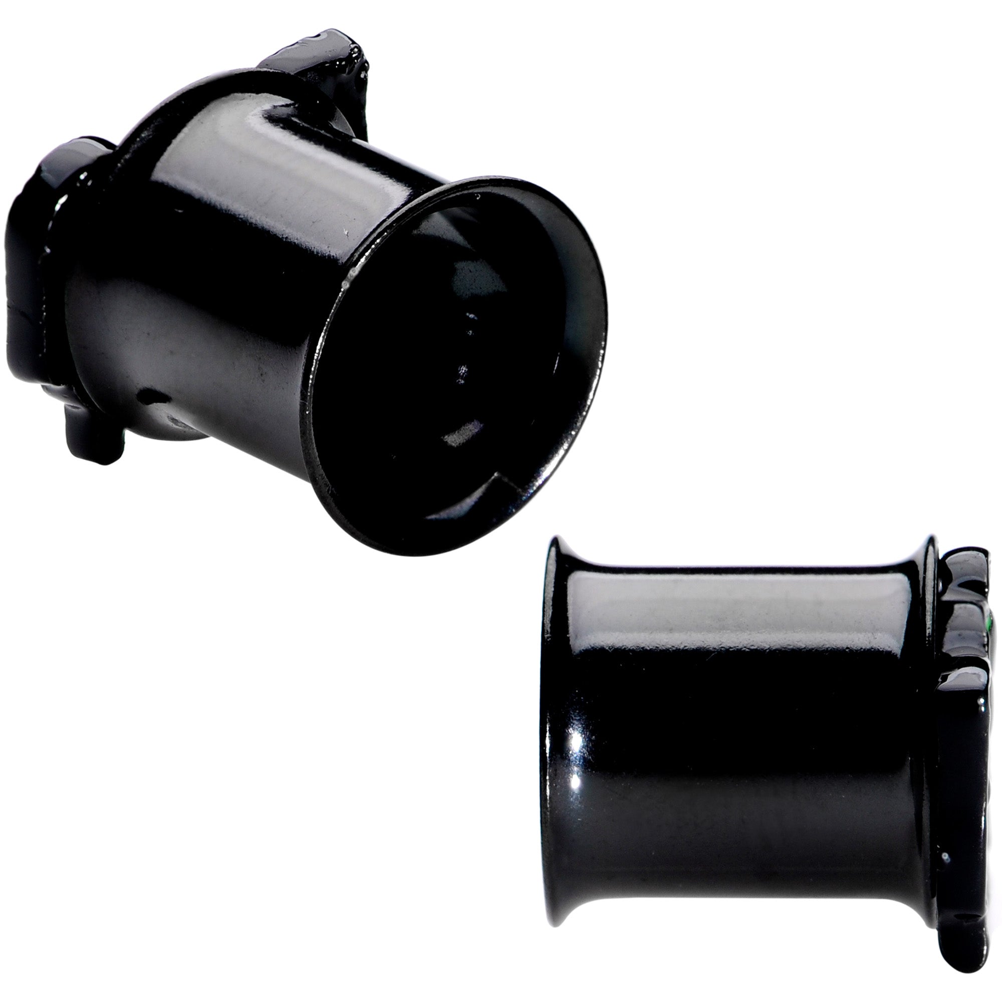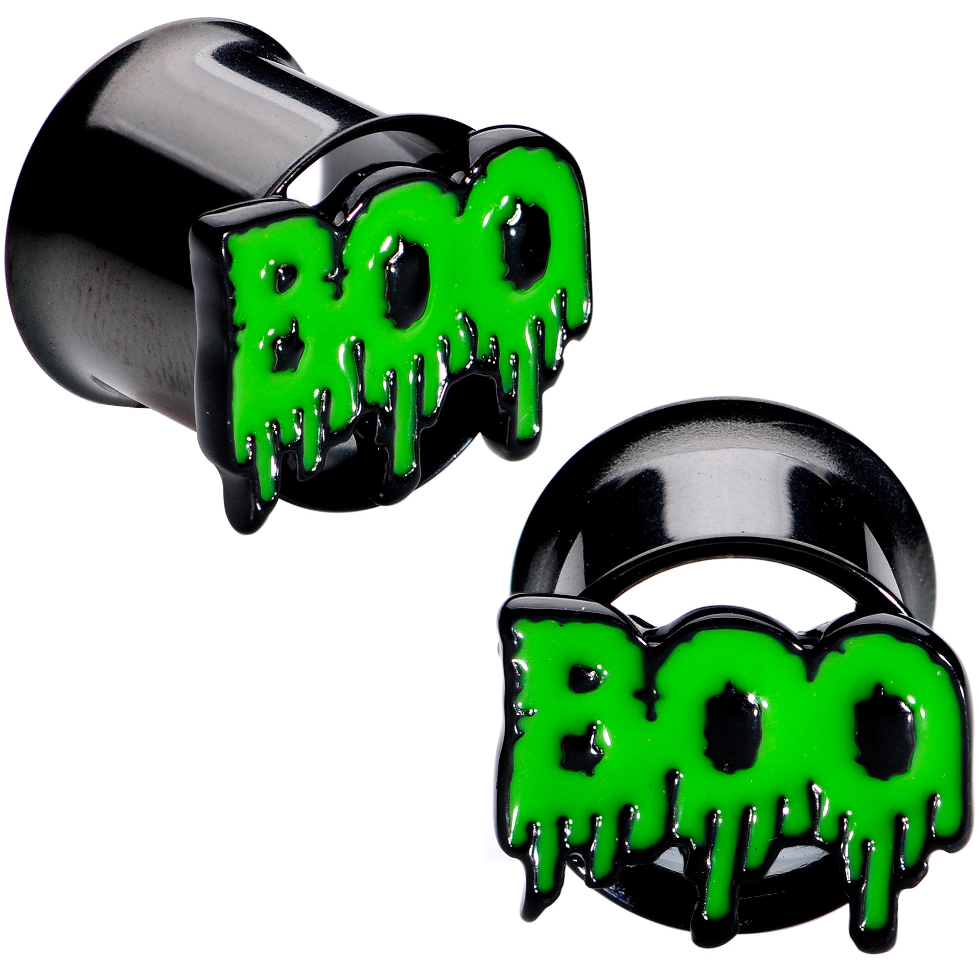 If you're looking for something spooky to wear this Halloween or anytime you're feeling scary then you will love these black ear plugs! Made with black PVD over 316L surgical grade stainless steel, these ear gauges feature bright green letters on the front that spell "BOO" in dripping, Halloween letters for tons of fun! Sold as a set of two.