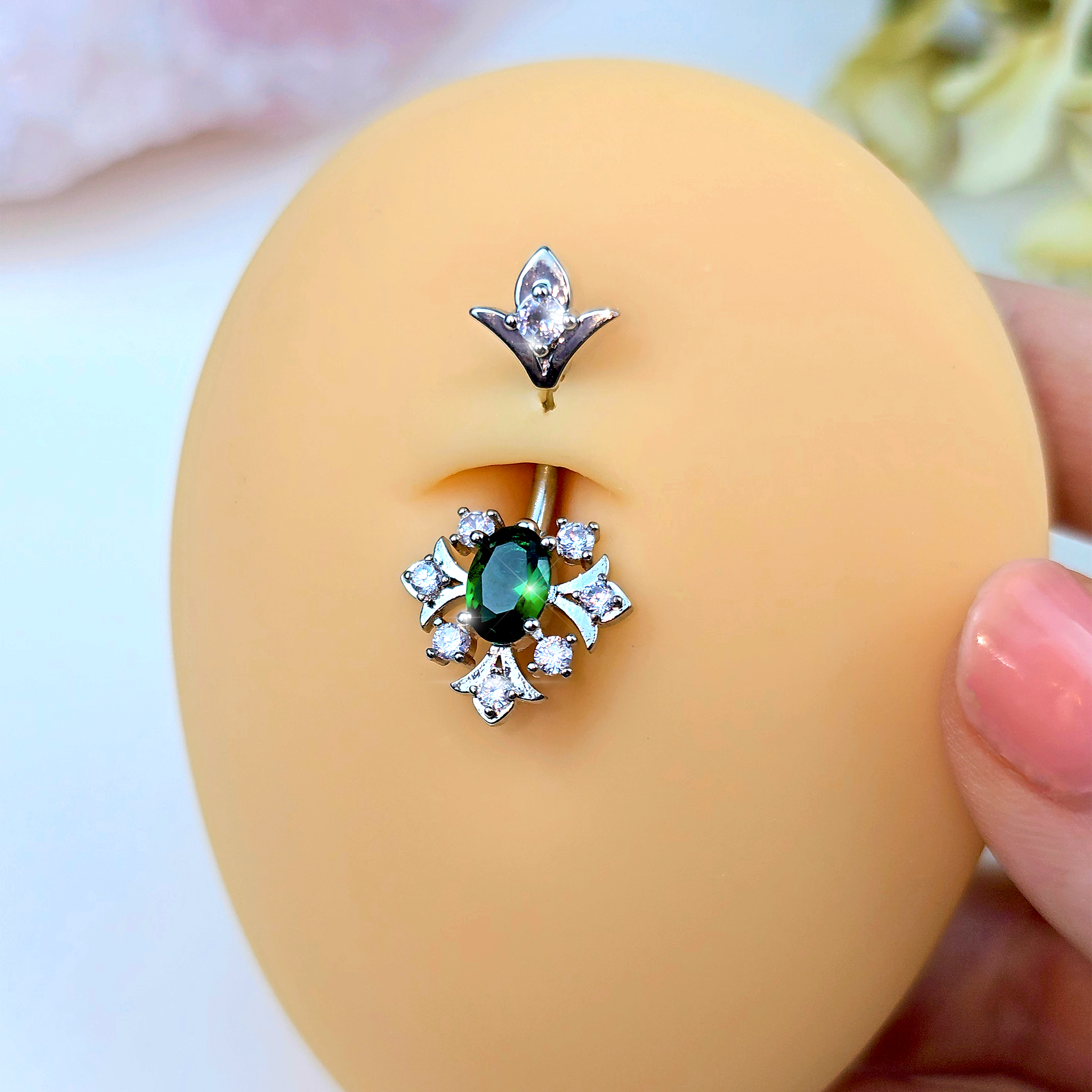 Green Clear Gem Ornate Art Deco Double Mount Belly Ring