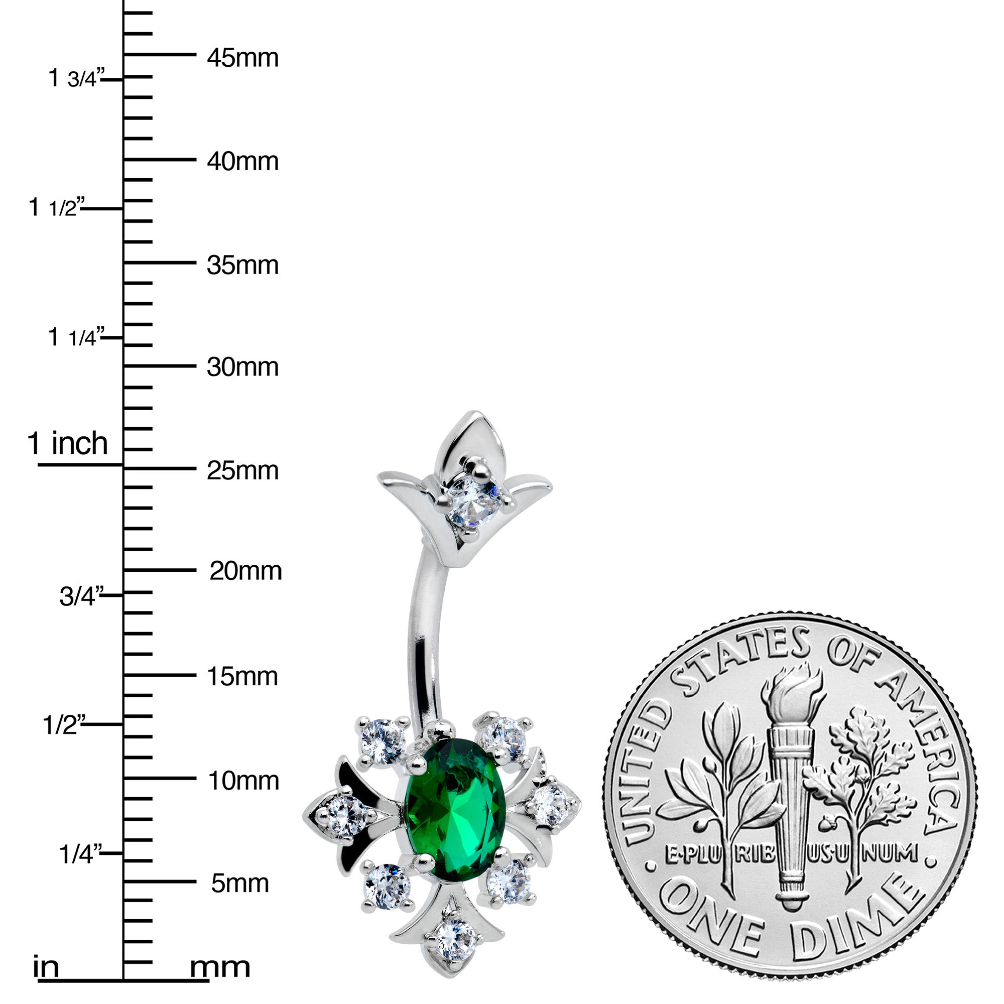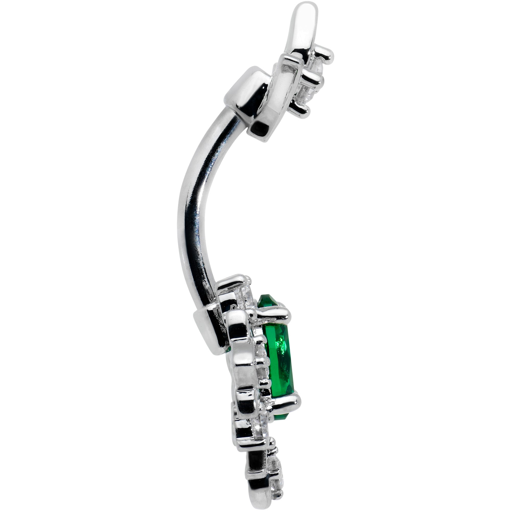 Take your navel piercing back in time with this antique-inspired 14 gauge belly button jewelry! It's made with a 3/8" durable 316L surgical grade stainless steel curved barbell. The top end features a V-shaped charm, set with a small clear gem. The bottom end features a large, oval green gem charm, set in a V that's embellished with clear gems for a cohesive appearance. Give an antique-inspired look to a modern piercing with this art deco styled navel jewelry!