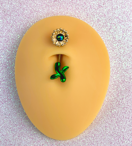 Beautiful and fragrant, sunflowers are the prettiest flower! Wear a pretty sunflower on you all of the time with this 14 gauge green gem sunflower flower belly ring. One end of this belly button piercing features a green faux opal gem sunflower with gold tone petals, while the other end features a leafy green stem. The sunflower belly button ring is 3/8" in length and is made with a durable 316L surgical grade stainless steel curved barbell.