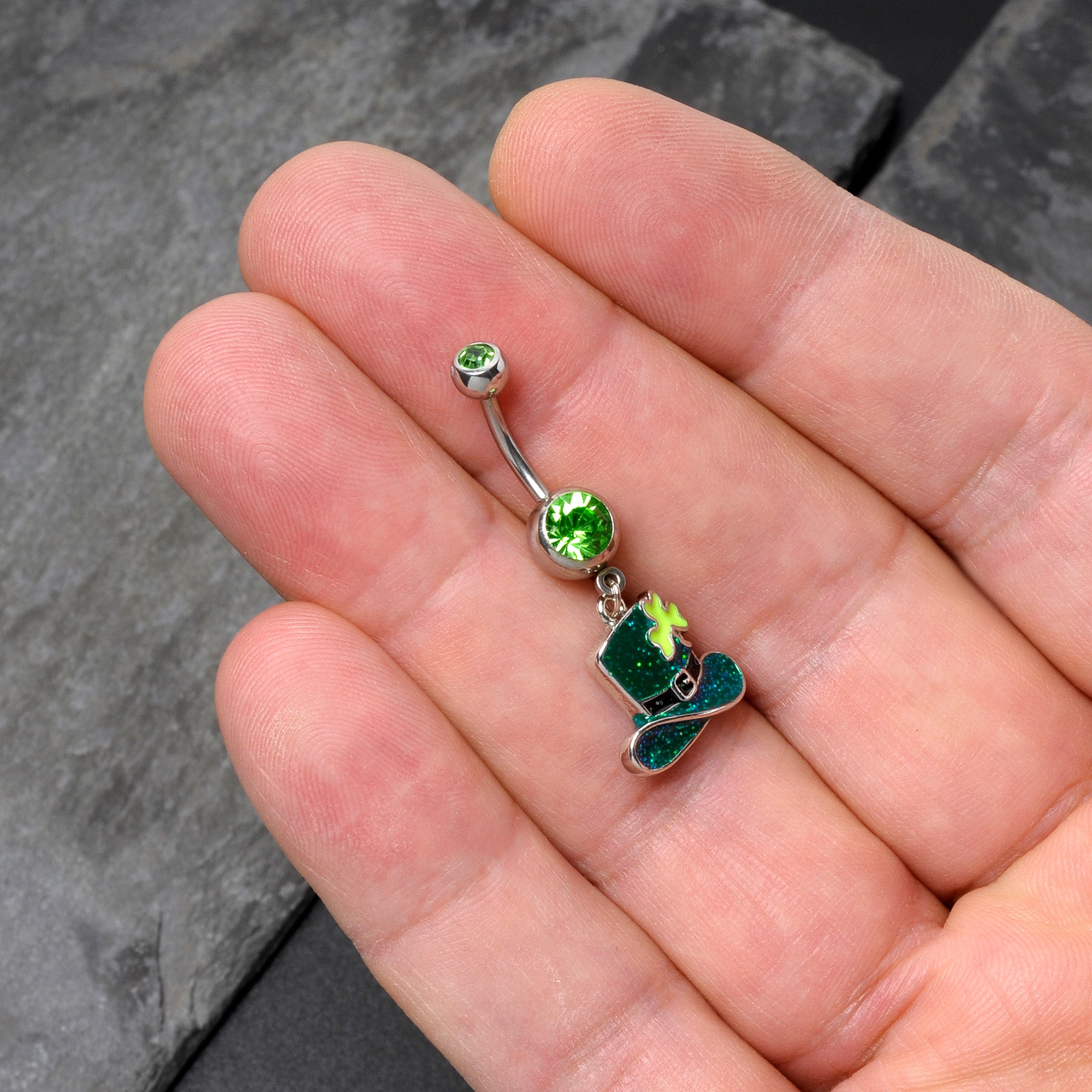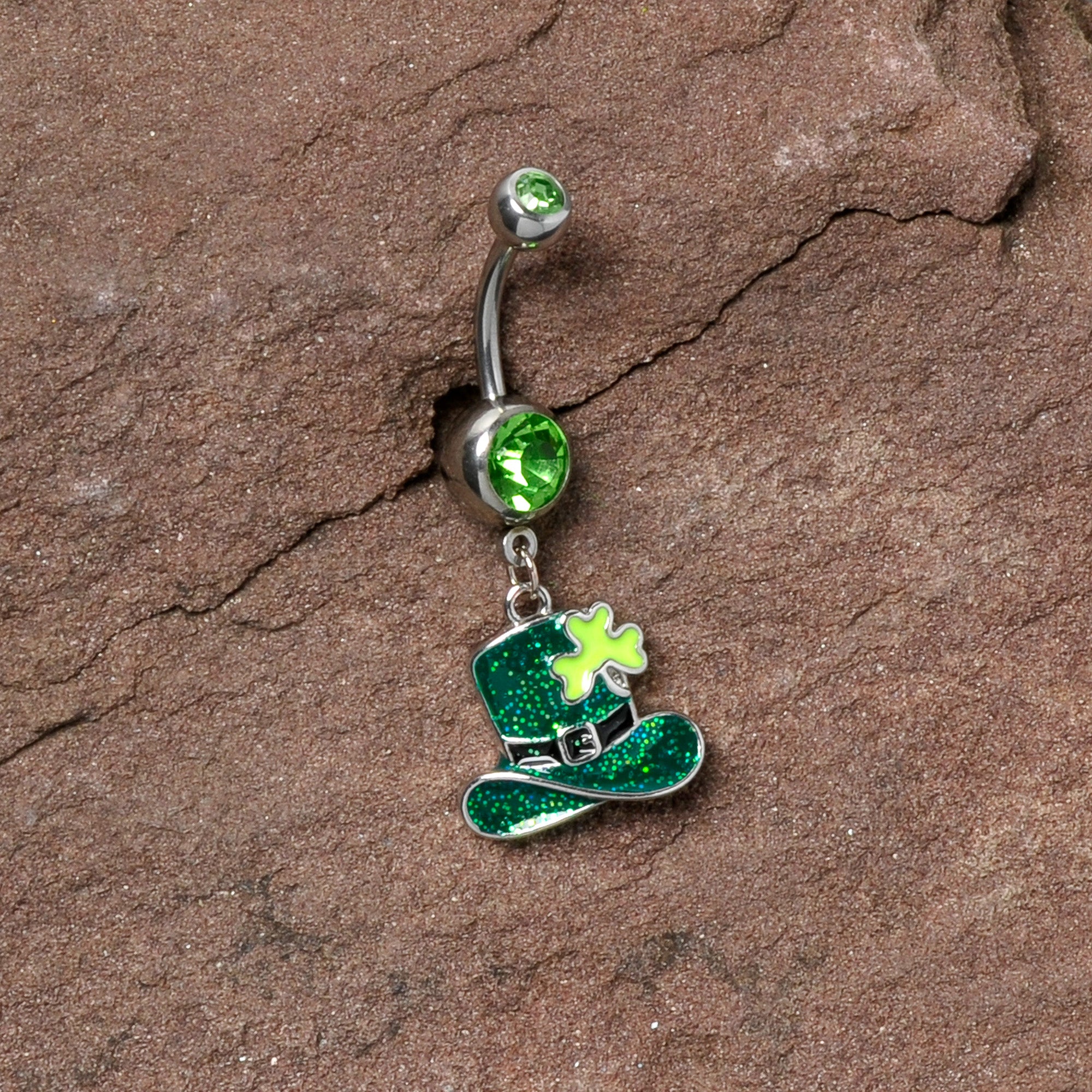 Green Gem Glitter Top Hat Shamrock St Patricks Day Dangle Belly Ring