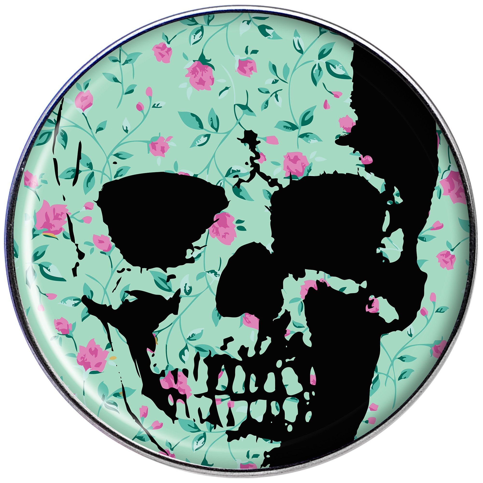 If you love scary style mixed with feminine floral prints then this cartilage jewelry is right for you! Made with a 7/16" durable 316L surgical grade stainless steel straight barbell, this tragus earring features a scary black skull image on a green and pink floral background logo inlay.