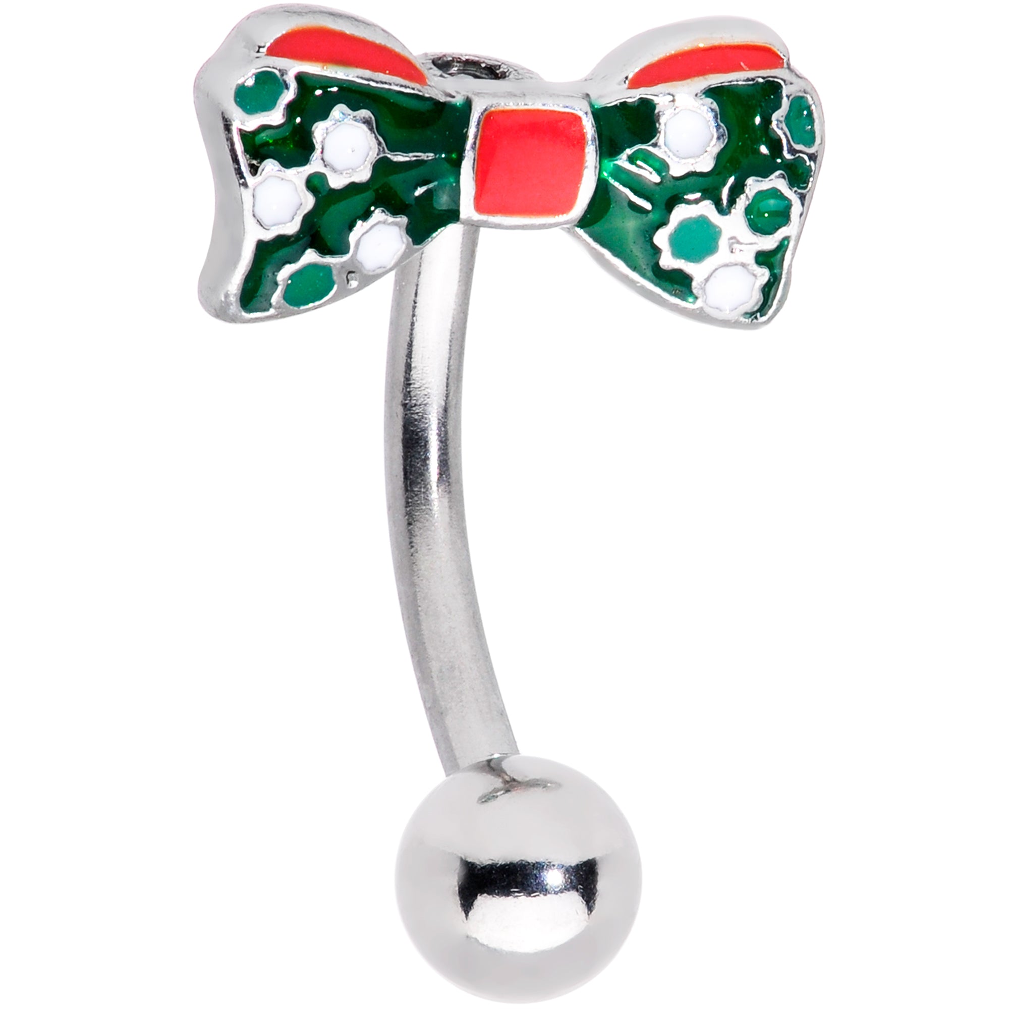If your belly piercing feels like a gift to yourself, wrap it up with this 14 gauge navel ring! It's made with a 3/8" durable 316L surgical grade stainless steel curved barbell with a 5mm top ball end. The bottom end features a cheery bow charm, with green ends and a red center. The bow is further embellished with white polka dots for a jolly feel. Give your navel piercing a holiday present with this fabulous, festive belly button ring!