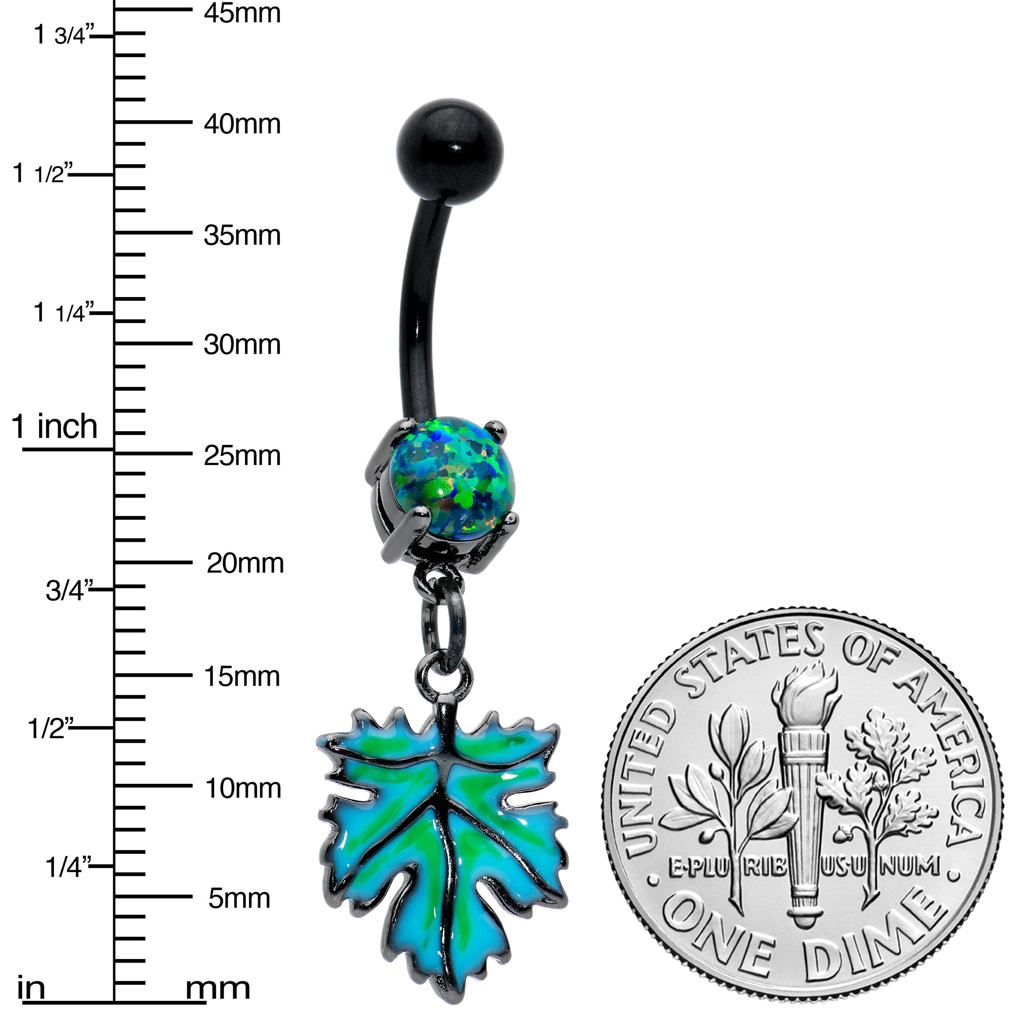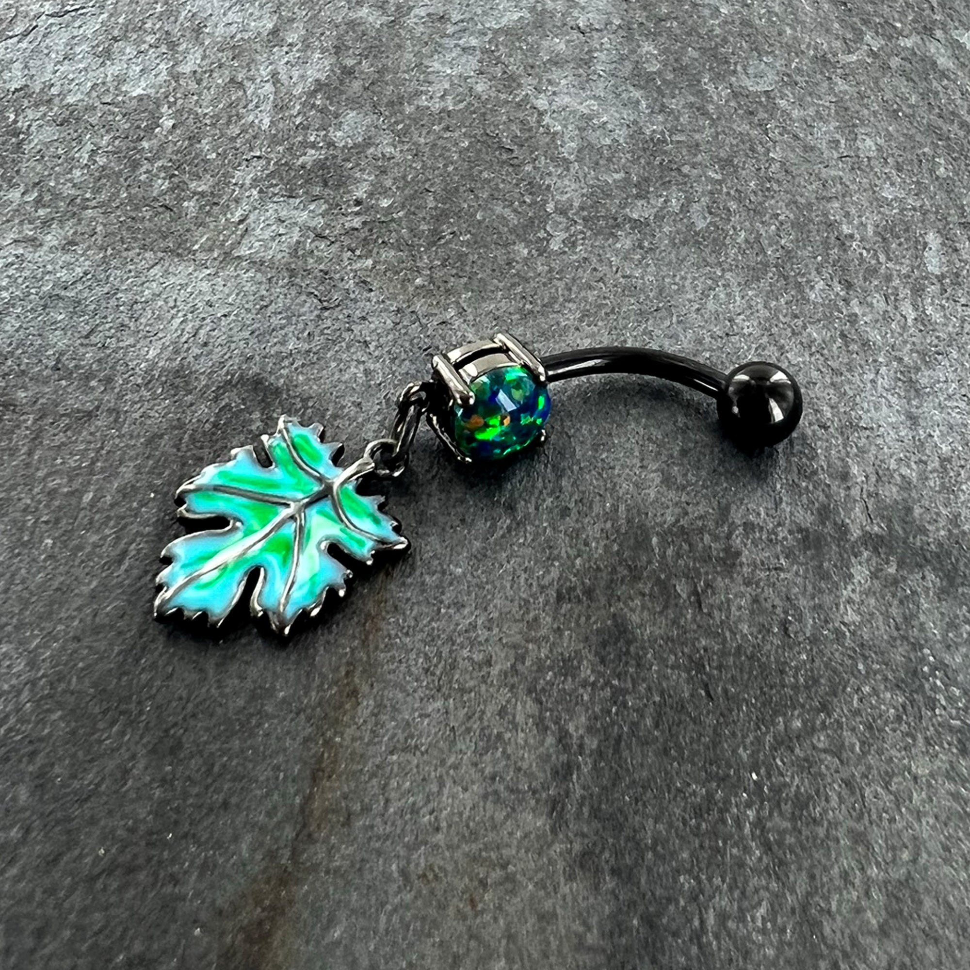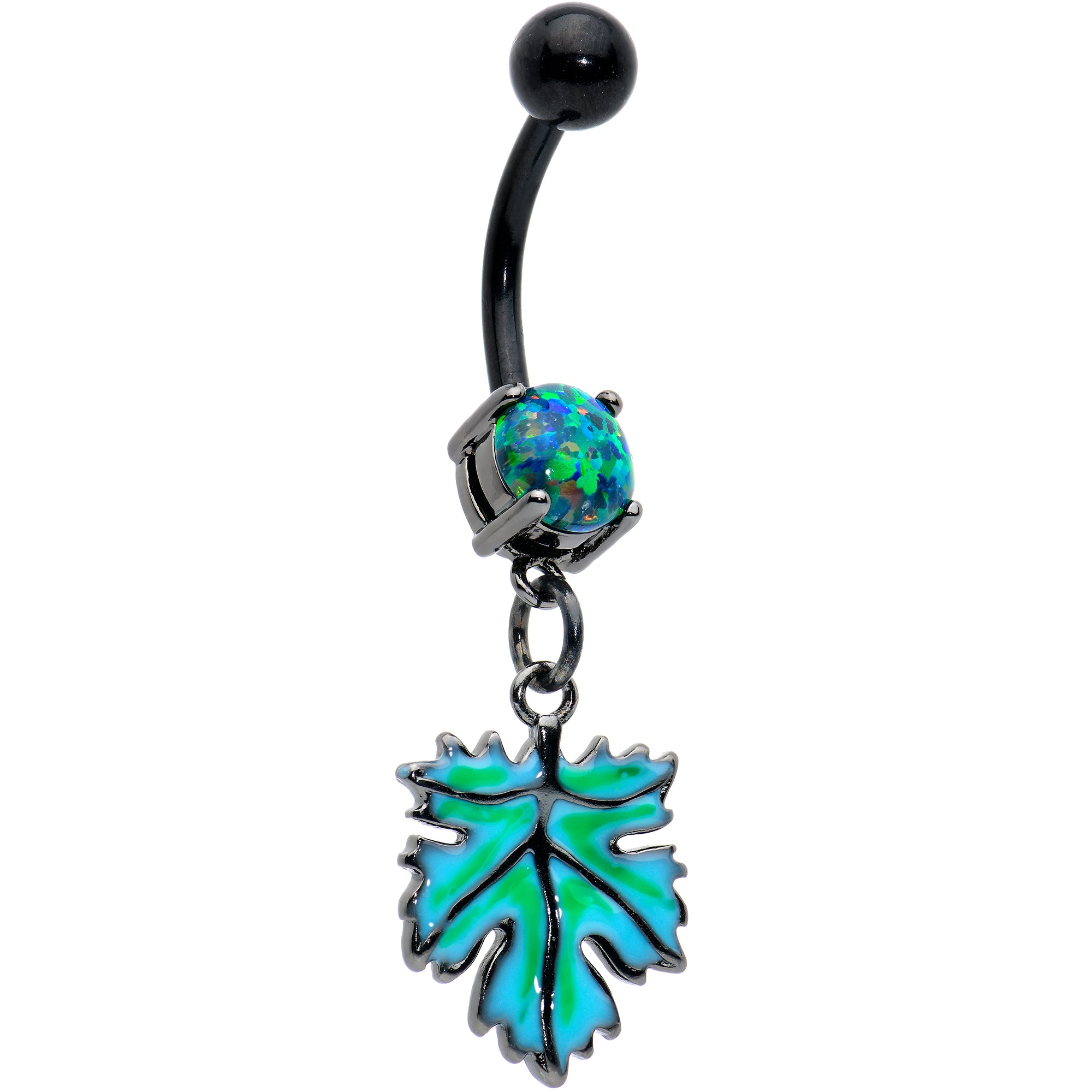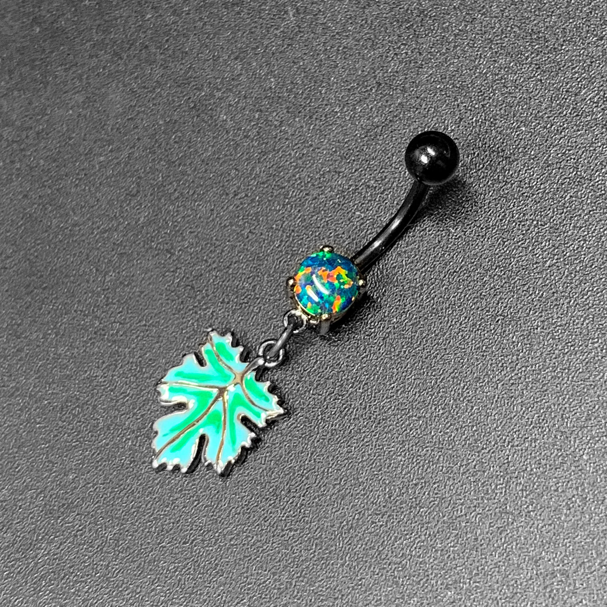 Green Synthetic Opal Black Fall Green Leaf Dangle Belly Ring