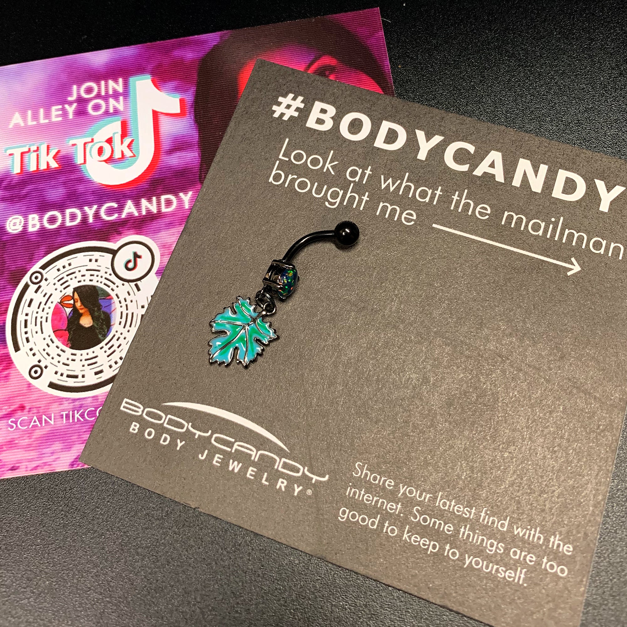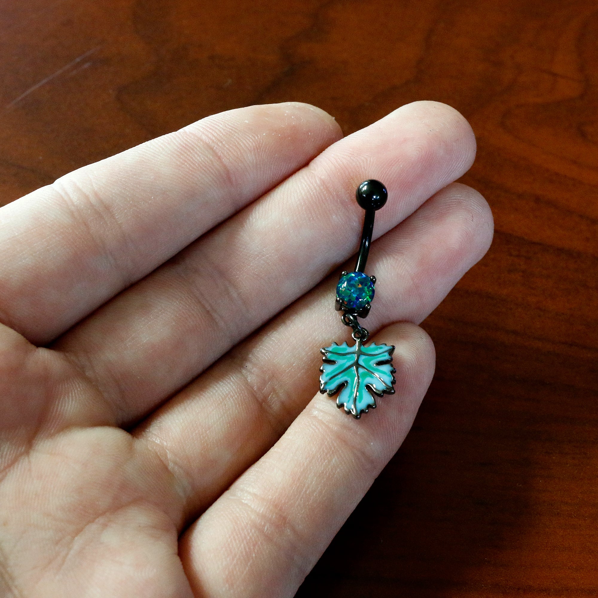 This 14 gauge navel ring will add some leafy green to your look! It's made with a 3/8" black PVD over 316L surgical grade stainless steel curved barbell with a 5mm top ball end. The bottom end is composed of a green synthetic opal for a look of colorful elegance. Dangling beneath it is a green inlay maple leaf charm for a cohesive appearance. You'll never want this leaf to fall when you're rocking this belly piercing ring!