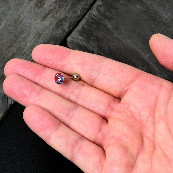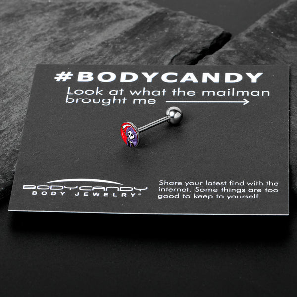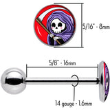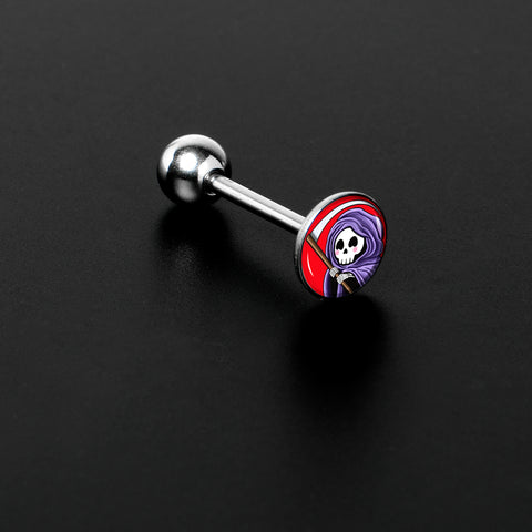 Death to boring belly jewelry - when you're rocking this 14 gauge tongue jewelry! It's made with a 5/8" durable 316L surgical grade stainless steel straight barbell with a 5mm bottom ball end. The top end features a disc shaped grim reaper charm with a vivid red background. The fantasy-styled grim reaper has a purple cloak and curving scythe for a traditional twist. If you're dying for a new look, this colorful tongue piercing ring is exactly what you're after!