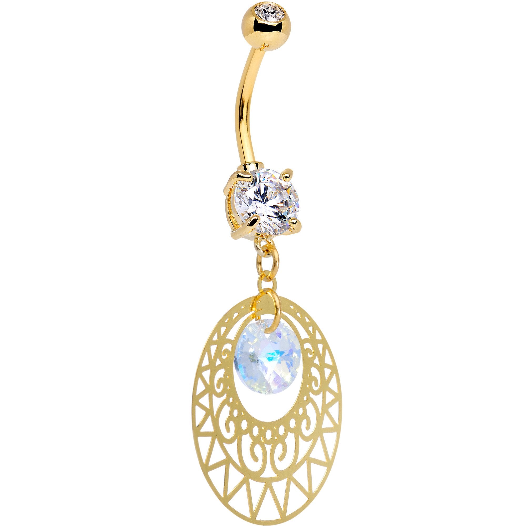 Let your beauty shine with this round filigree dangle belly ring. A circular filigree dangle is decorated with a central clear gem created with crystals on this beautiful belly button ring. The filigree charm is mounted on a 9/16" curved barbell made with yellow anodized titanium over 316L surgical grade stainless steel, complete with top and bottom clear gems. Handcrafted in the USA!