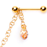 Feel the fall season with this fall foliage nipple chain. Featuring alternating leaf charms and crystals, this nipple chain is perfect for autumn. An adjustable 14" curb chain is decorated with green and orange leaf charms and connects two 14 gauge gold tone anodized titanium over durable 316L surgical grade stainless steel straight barbells measuring 5/8" in length. It's like a necklace for your breasts and it's handmade in the USA!