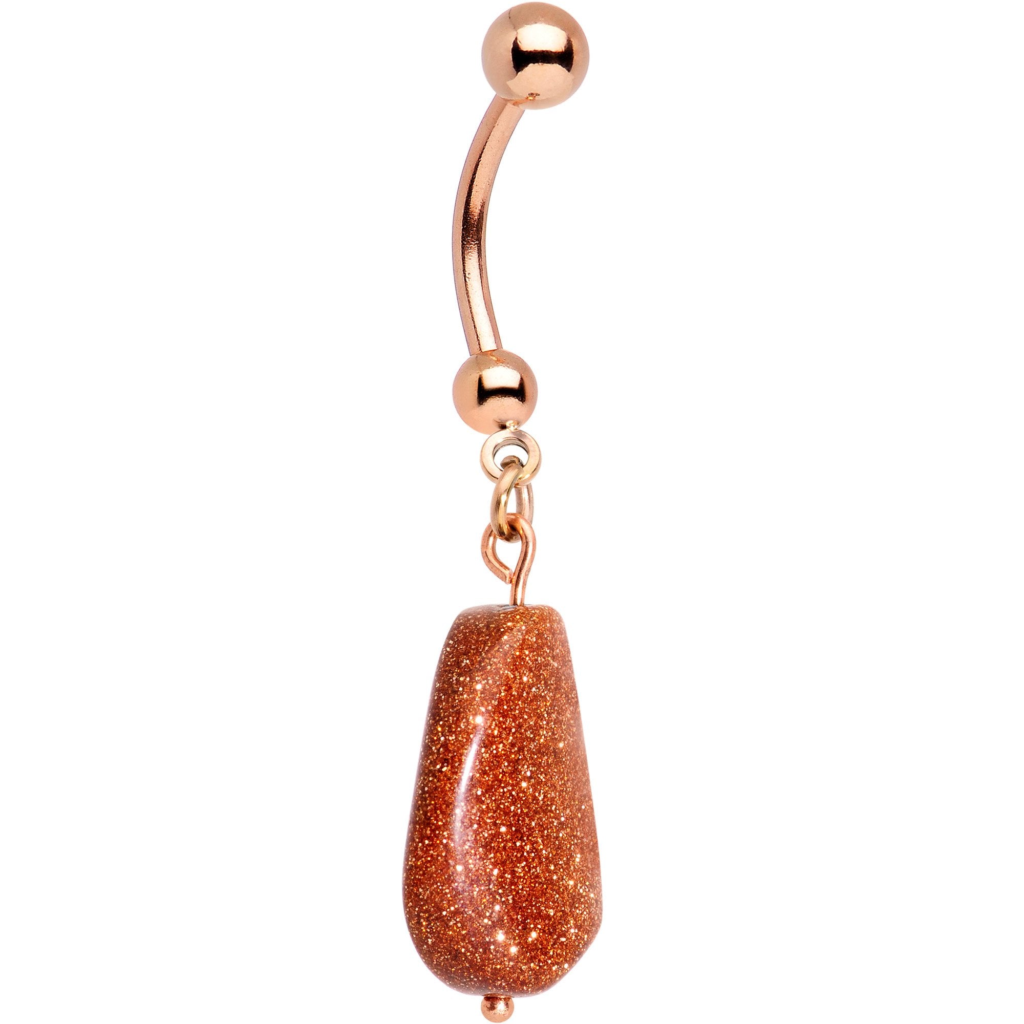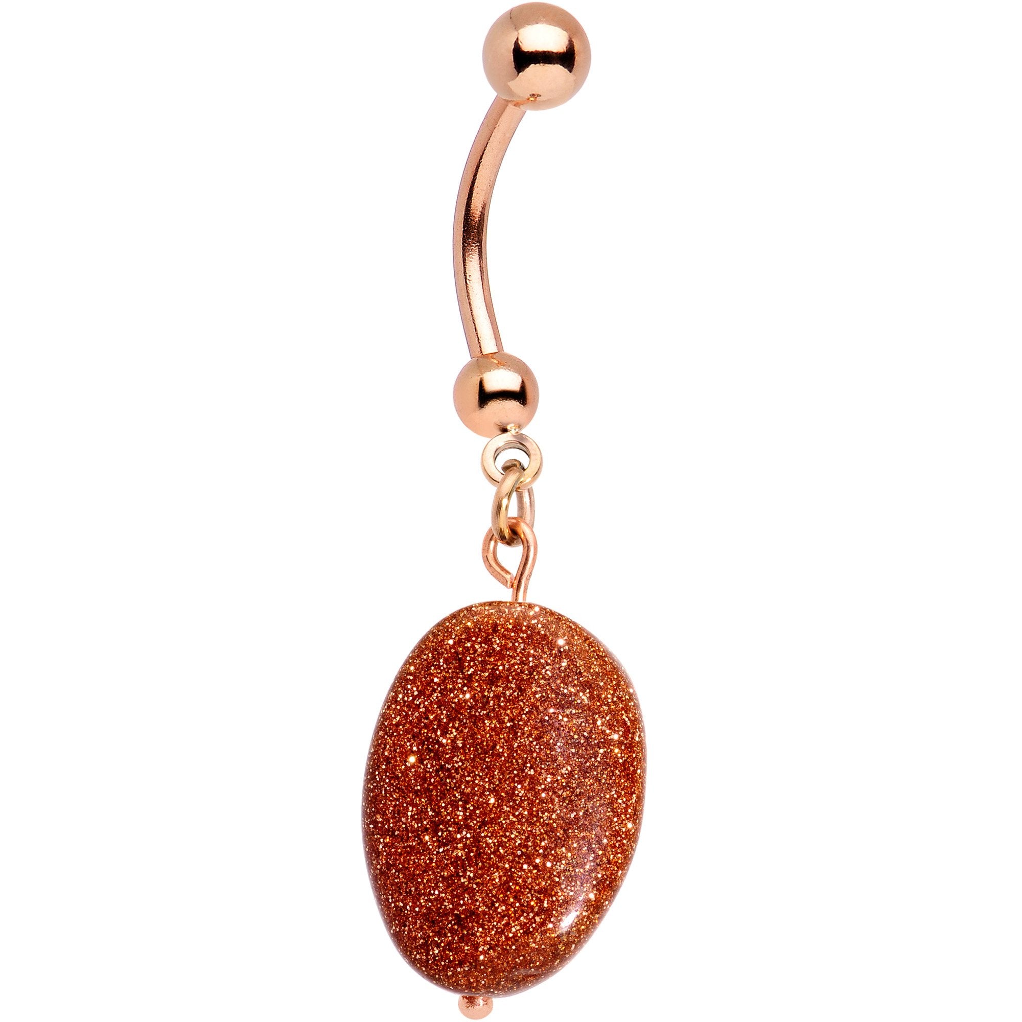 Lustrous, shimmering stones are the perfect accessory for any event and this belly button ring is all about luster. Made with a rose gold PVD over 316L surgical grade stainless steel curved barbell, this 14 gauge navel jewelry features a goldstone dangle charm that exudes elegance and is handcrafted in the USA.