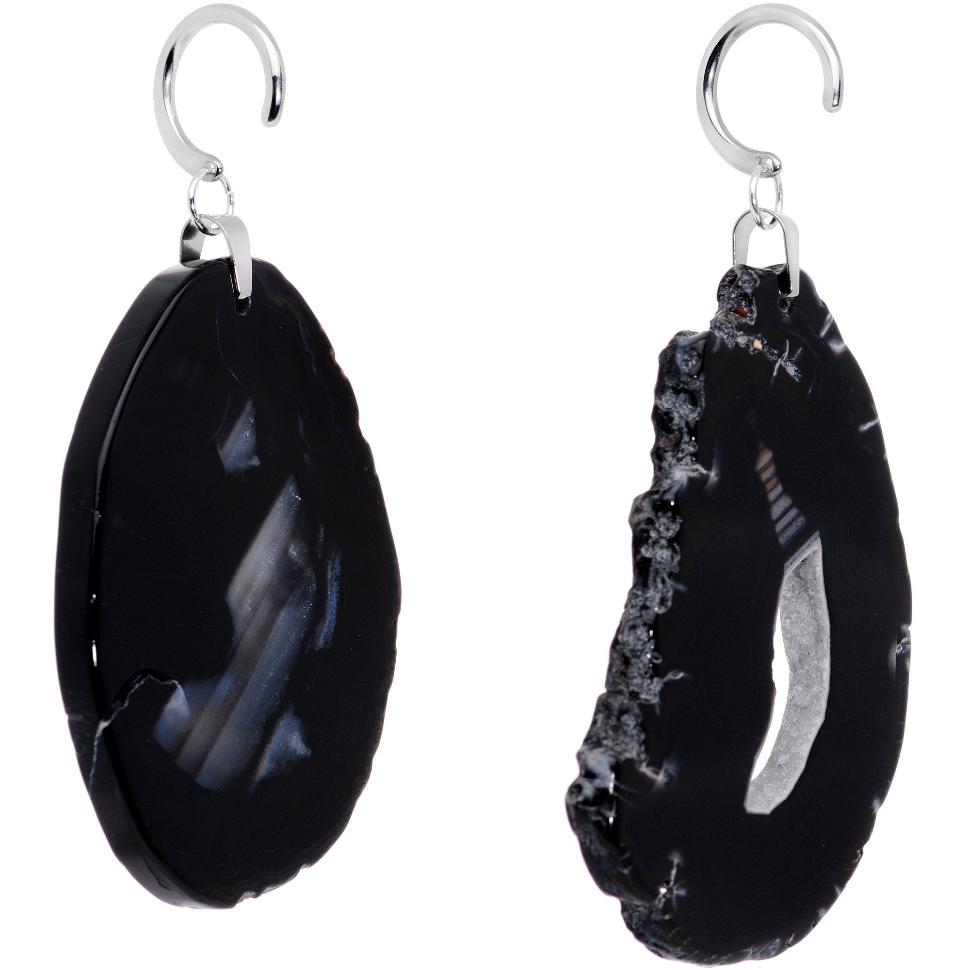 Show off your love of all things natural and black as a glorious gothic night when you wear this pair of handcrafted dangle tunnel plug earrings. Made with durable 316L surgical grade stainless steel hook backings, these stretched ear hangers require a 10 gauge minimum size, can be worn alone or with tunnel plugs, and are made with natural black agate irregular shape stones with varying patterns of color and texture in each individual stone, making each one unique. With a total length of 108mm and a weight of 3.8oz, these natural stone ear weights are handmade in the USA and are sold as a set of two for you.