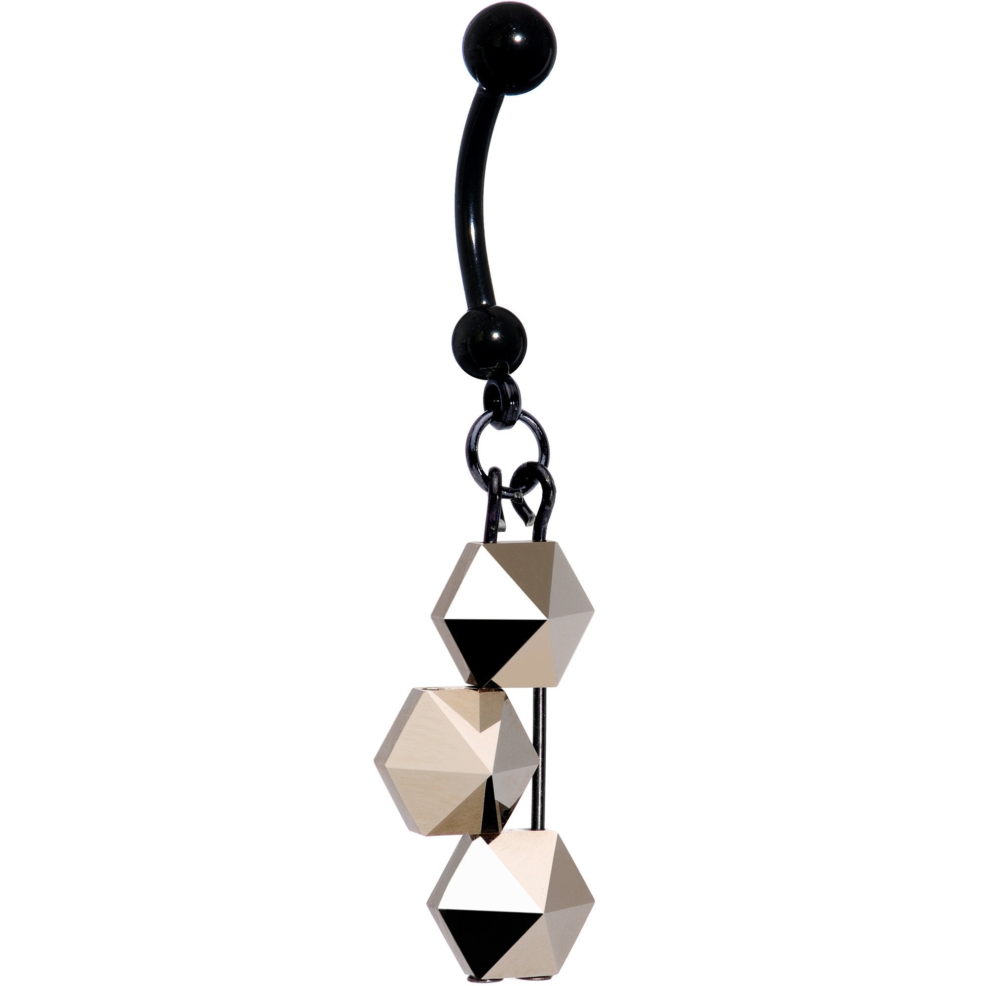 A daring cascade of decadent geometric shapes is the central focus of this 14 gauge belly button ring. This navel piercing is made with a 7/16" black anodized titanium over 316L surgical grade stainless steel curved barbell, created with crystals, and is handcrafted in the USA.